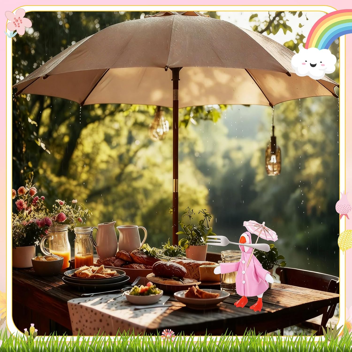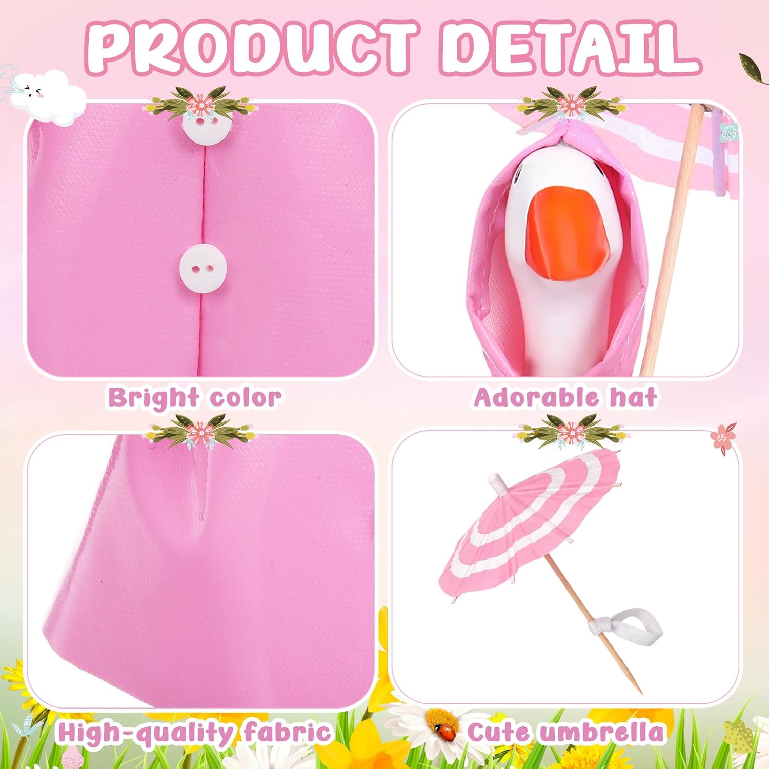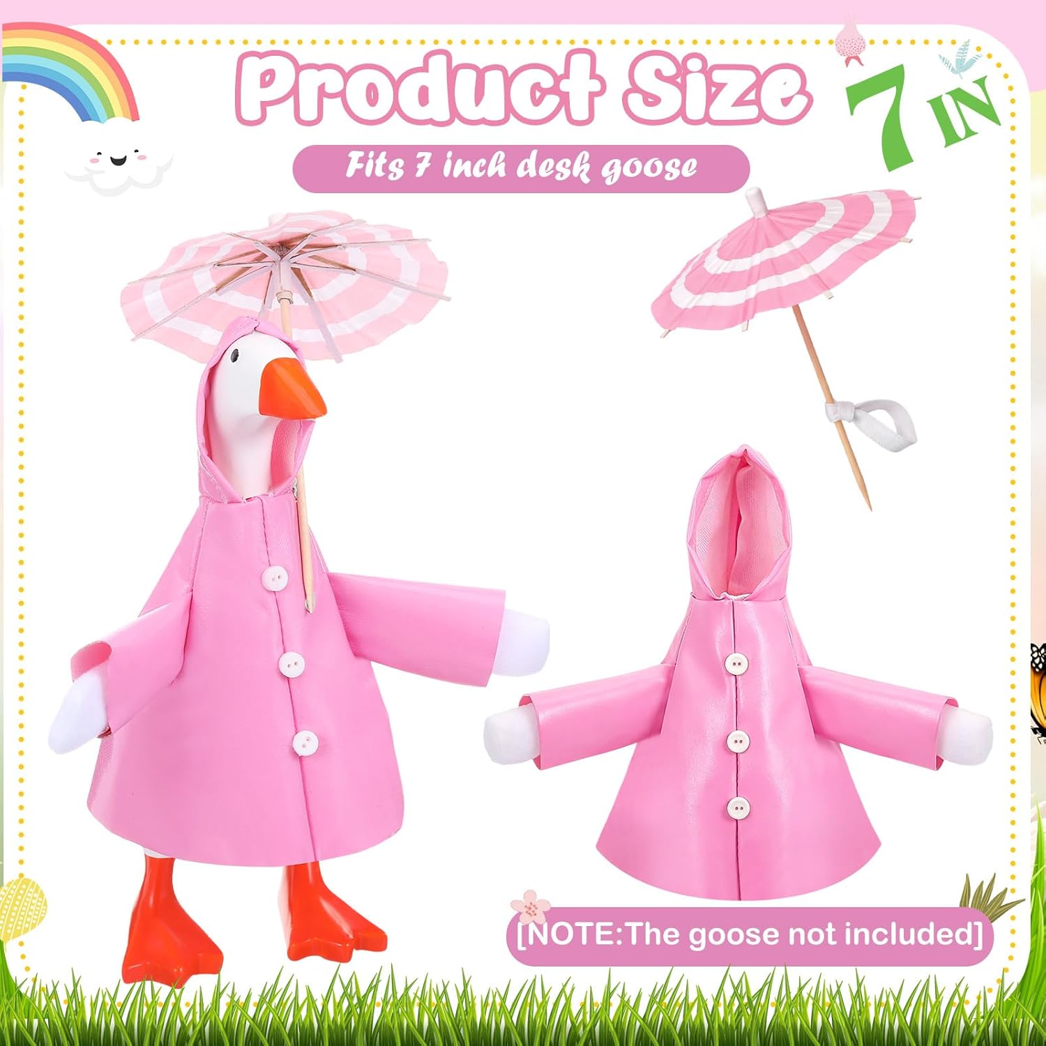 Features: Versatile and perfect for any celebration: These spring desk goose raincoat outfits make fun decorative pieces. Their versatility means they're not only tabletop goose outfits, but also perfect for enriching holiday decor. Easy Dressing: Dressing your 7 inch desk goose couldn't be easier. The structured spring raincoat maintains its shape, creating a delightful display. Bright and Fun Design: Featuring a sunny pink slicker, and an umbrella, this adorable outfit brings a pop of color and a playful touch to your home or porch, perfect for casual cookouts, indoor parties, or everyday decor. Specifications: Material: high quality leather Color: pink Size: suitable for 7 inch desk goose Package Includes: 1 x Mini desk goose spring raincoat 1 x Mini desk goose spring umbrella Notes: Sizes may vary slightly due to manual measurement. Colors may vary slightly due to screen display. [note: goose is not included]