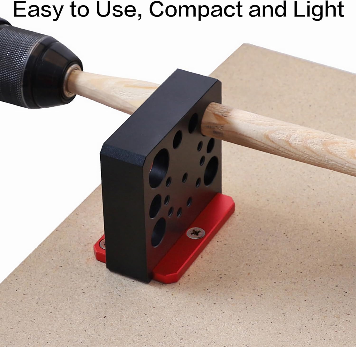 Specifications:Product name: dowel maker jig kitMaterial: CNC aluminum alloy + surface anodizing treatmentColor: black and redSize: 3.34*3.14*1.96"Blade material: carbideBlade specification: 0.59*0.59*0.1"Round hole diameter:5/16"(=7.9mm),3/8"(9.5mm),7/16"(11.1mm),1/2"(12.7mm),9/16"(14.3mm),5/8"(15.9mm),11/16"(17.5mm),3/4"(19.1mm).Parts list:1 * dowel maker jig1 * Blade wrench (T20)1 * Adjustment wrench (5mm hexagonal wrench)3 * Fixing screws1 * 4mm drill bit1 * Rounding Nail head1 * Spare blade2 * 600 grit sanding sponge (70x100x5mm)Operation steps:1. Sharpen one end of the wooden square rod, install it in the clamp of the electric drill and lock it.(Or use a drill to drill a pre-drilled hole at the intersection of the diagonal lines of the wooden square rod, insert the self-tapping end of the rounding nail head into the wooden square rod, and fix the hexagonal end on the electric drill).2. Sharpen the other end of the wooden square rod and insert it into the fixture hole.3. Loosen the red tool holder screw, rotate the tool holder to the hole position, and lock the screw.4. Start the electric drill, slowly push forward, and turn out the round rod.