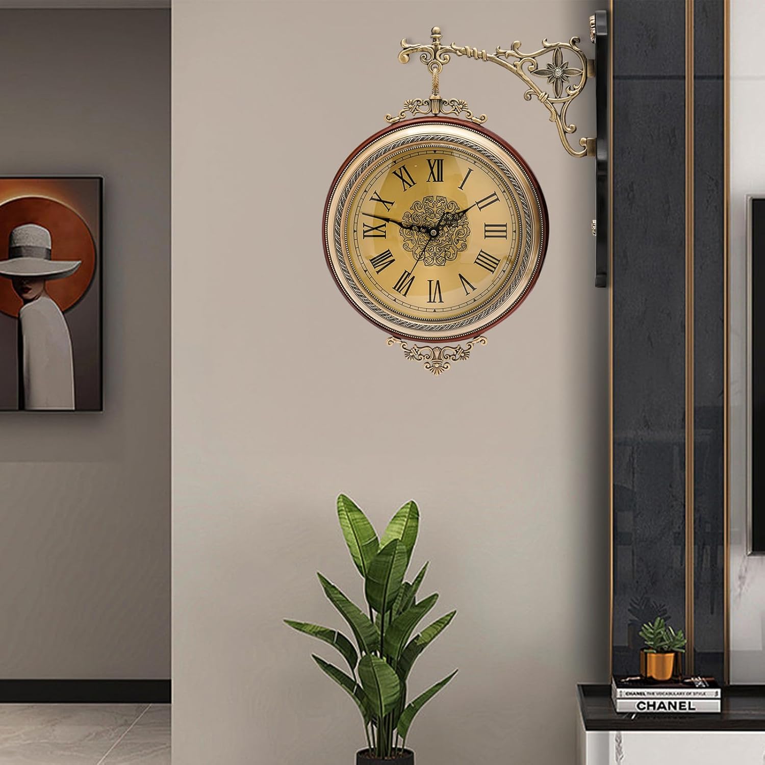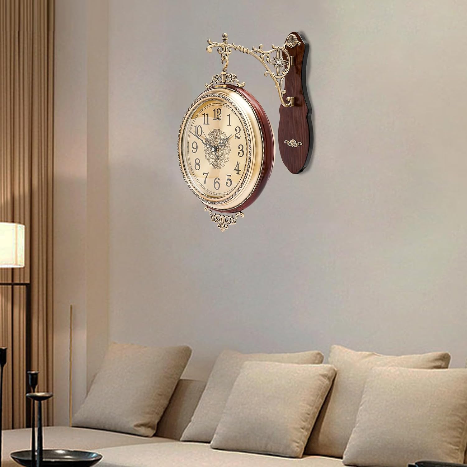 DescriptionOur double-sided wall clock not only tells the time accurately, but its vintage style looks great in any room. Its silent movement ensures a quiet environment while you rest and work. The double-sided dial design gives you multiple angles suitable for viewing. It will surely be your ideal choice.ApplicationIt is suitable for use as a wall clock and wall decoration in bedrooms, dining rooms, living rooms, entrances, offices, hotels, classrooms, cafes, meeting rooms, and so on. SpecificationMaterial: Wood, Alloy, GlassColor: Brown, GoldenStyle: VintageProcess: Spray Paint, ElectroplatedShape: RoundIndoor/Outdoor Usage: IndoorAssembly Required: YesMounting Type: Wall-MountedBattery: 2*AA Carbon-zinc Battery(Not Included)Gross Weight: 2.4 kg/ 5.29 lbs Net Weight: 2.1 kg/ 4.63 lbsPackage Size: 49*42*9 cm/19.29*16.54*3.54 inProduct Size(H*W): 46*37cm/ 18.1*14.6inWall Hanging Size: 27*8cm/ 10.6*3.1inDial Diameter: 24cm/ 9.4inClock Diameter: 30.5cm/12inPackage Included1*Double-sided Wall ClockAll Accessories for InstallationNotesPlease allow the slight color difference caused by the shooting light and the 1-3 cm error due to manual measurement, and make sure you do not mind before ordering.