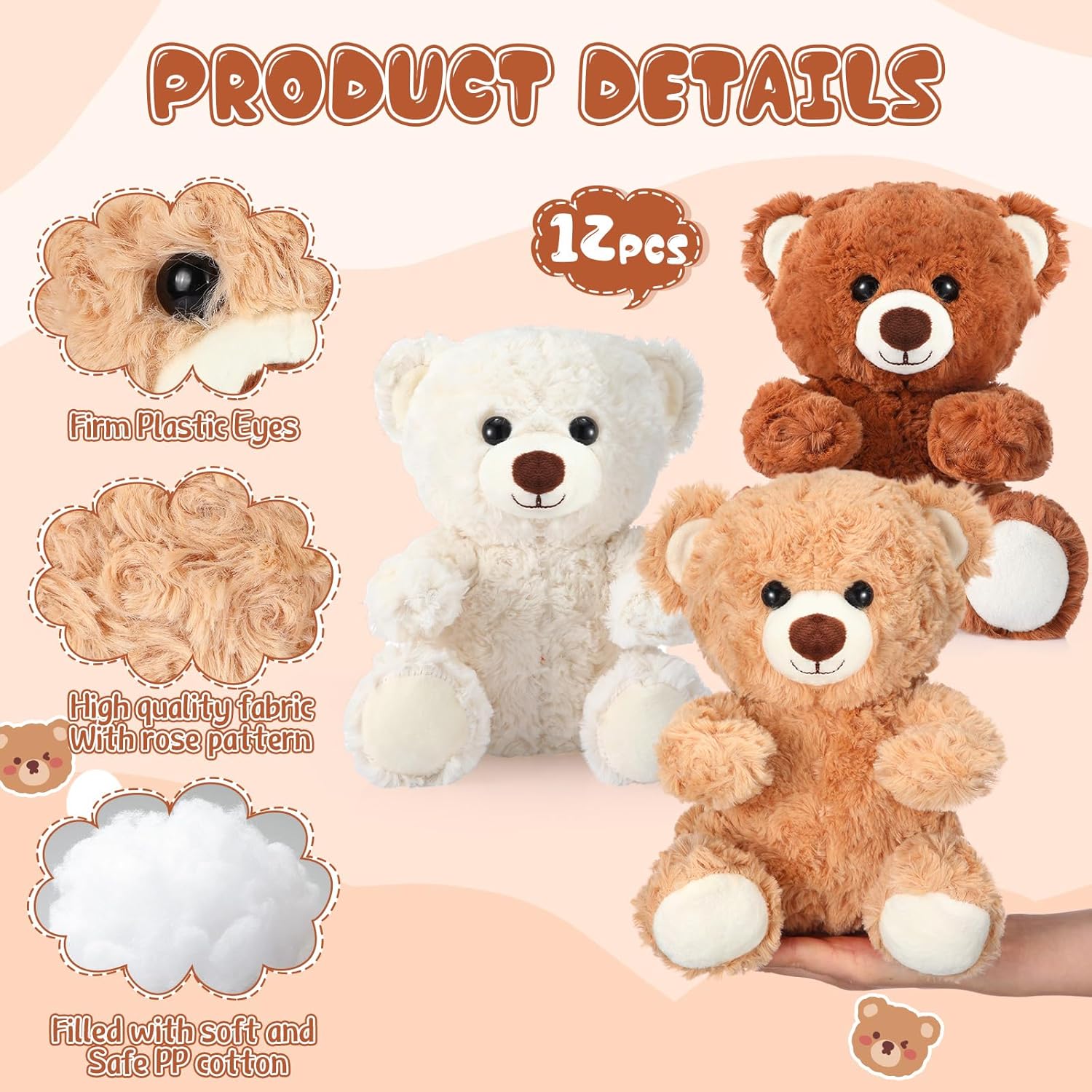 Features: Dressed in a beautiful light brown color, the stuffed bears have a traditional and classic appearance that is universally loved by people. Their cute and endearing design makes them a delightful addition to the plush toy collection, making them equally appealing to little ones and adults alike. These cute bears are carefully crafted using polyester and PP cotton materials, ensuring a soft and cuddly touch. Easy to carry due to their lightweight nature and suitable size, these bear plush toys can be toted around effortlessly by boys and girls. Whether it's a trip to the park, sleepovers at a friend's house, or traveling for vacations, these bears can accompany you without trouble, providing comfort and companionship where they go. With their charming light brown color and cute design, they make the ideal companions for people. Specifications: Material: polyester and PP cotton Color: light brown, dark brown, beige Size: about 8 inches Package includes: 8 x Cute bears Notes: Manual measurement, please allow slight errors on size. The color may exist a slight difference due to different screen displays