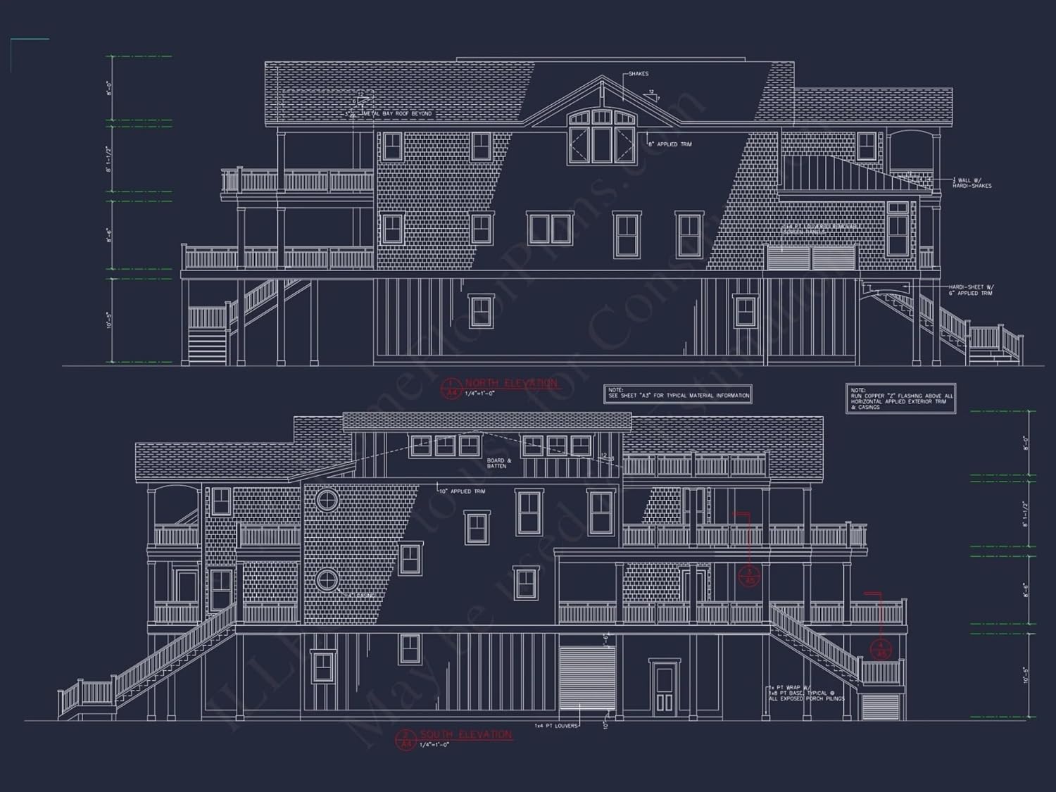 Coastal Beach House Plan with 3 Stories, Elevator & Expansive Outdoor SpacesDiscover this stunning coastal beach house plan with 4,159 heated sq. ft., 5 bedrooms, 5 baths, and a piling foundation—perfect for waterfront living.This coastal beach house plan is designed for homeowners who crave open air, panoramic water views, and timeless seaside architecture. Built on a sturdy piling foundation, this home thrives in beach and coastal regions where durability meets elegance. The architectural composition reflects relaxed sophistication, blending natural light, spacious decks, and outdoor connectivity. Coastal Architecture Meets Modern ComfortThis plan reimagines coastal living with practicality and luxury in perfect harmony. Elevated for flood protection and designed for maximum outdoor connection, the home's three levels offer seamless transitions between private retreats and social gathering zones.The grand entry, accessible via exterior stairs or elevator, leads into an expansive open-concept living area. Large sliding doors blur the boundaries between indoors and out, inviting sea breezes and natural light throughout the interior.Key Features of the Coastal Beach House PlanLiving Areas - Heated & UnheatedHeated area: 4,159 sq. ft. spread across three luxurious levels.Unheated extras: Expansive porches, multiple decks, and covered patios ideal for outdoor dining and sunset viewing.Garage: 3-car garage located at the ground level, integrated seamlessly with the piling foundation.Bedrooms & Bathrooms5 total bedrooms, including two spacious Owner's Suites—one designed for main-floor convenience and another with sweeping balcony access.5 full bathrooms plus a powder room ensure comfort for family and guests alike.Each bedroom enjoys coastal light and proximity to outdoor spaces for morning coffee or evening relaxation.Interior Design & FinishesOpen-concept layout merges kitchen