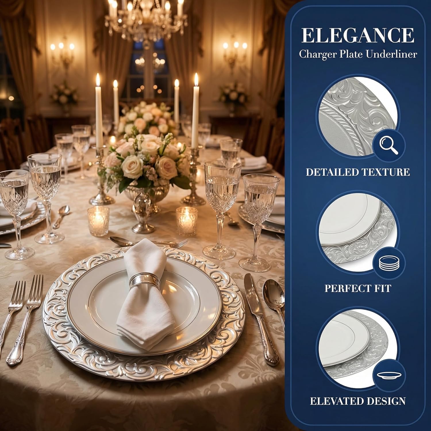 • Practical and Convenient - use these elegant plate chargers at your party or event for an extra easy clean up and no dishes to wash.Charger for Dinner Plates can easily match with 10" dinner plates and 7" salad plates, they are ideal table decorations.