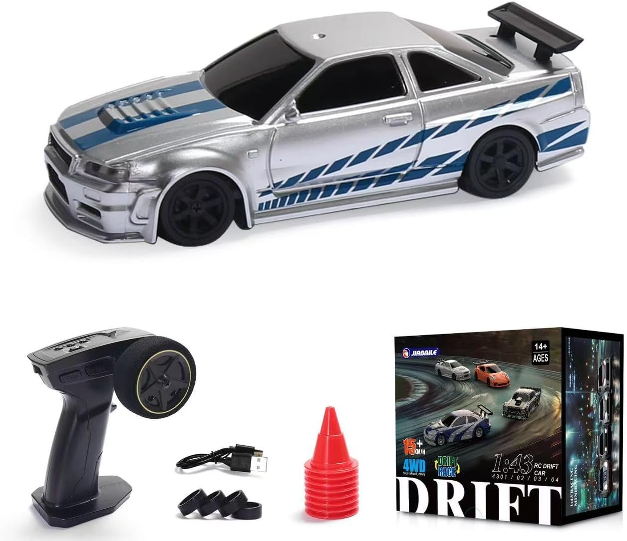 Specifications:.Color: White.Material: ABS + Metal + Electronic Components.Name: 1/43 Scale RC Mini Drift Car.Scale: 1:43.Drive Mode: 4WD (4-Wheel Drive).Speed: 15 KM/H.Motor: Hollow Cup Brushed Motor.Servo: Digital Servo.Frequency: 2.4GHz.RC Distance: ≥20m.RC Type: Full Proportional Synchronous RC.RC Time: About 30min (Full Speed).Charging Time: About 1h.RC Battery: 4 * AAA Batteries (Not Included).Car Battery: 3.7V 200mAh Li-po Battery (Included).Charger: USB Charger.Product Weight: 250g.Product Dimensions: 11 x 4.5 x 3cm.Package Dimensions: 18.5 x 16.5 x 11cm.Package Weight: 310g.Packing: Graphic Carton.Ages: 16+.Remote Controller *1.Charging Cable *1.Instructions *1.Racing/Drift Tires *4.Traffic Cones *8