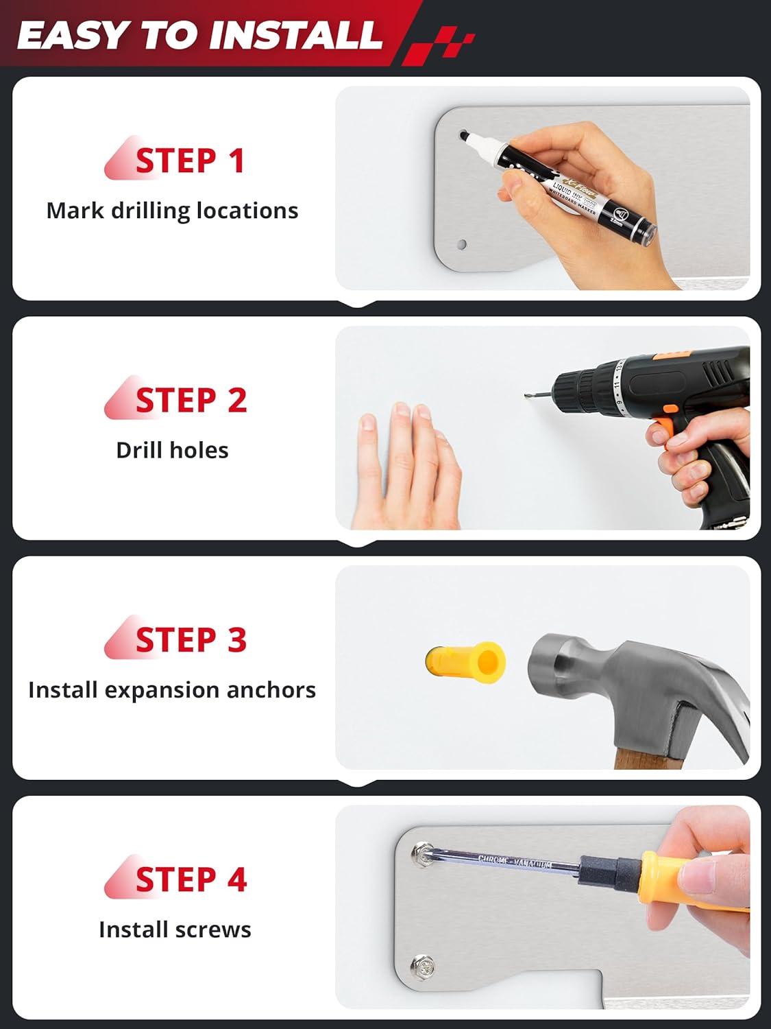| Included Components | 1x Lower storage shelf tray, 1x Upper mounting bracket with hook, 8 x Mounting screws, 8 x Wall anchors |