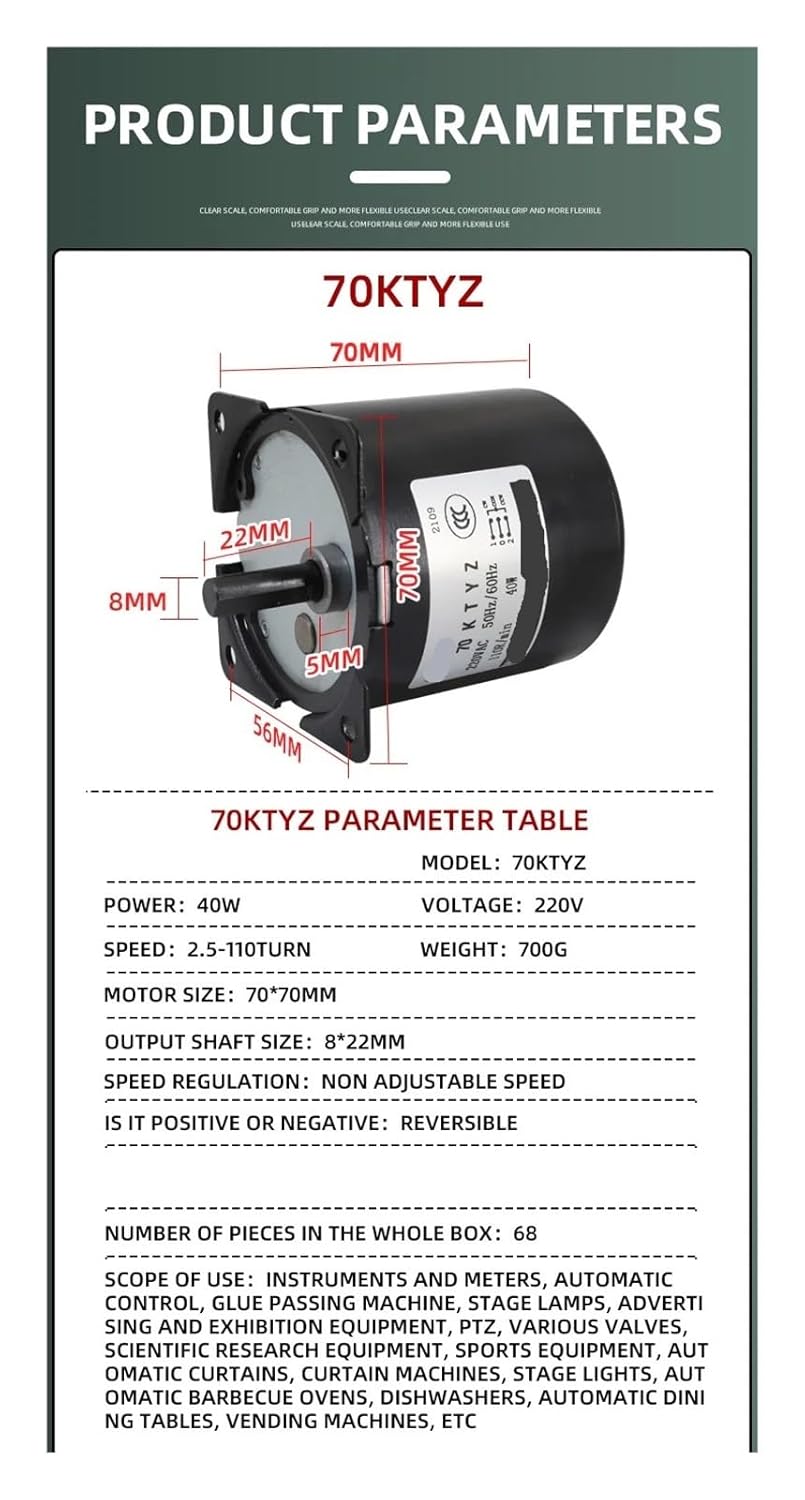 70KTYZ Permanent Magnet Synchronous Motor High Torque Metal Geared Reducer Forward Reverse Controllable110V 220V AC Electric Motors1. 70KTYZ Mini 220V AC Permanent Magnet Synchronous Motor2. The motor has the following voltage options: AC 220V3. AC 220V ; You can choose the no load speed have : 2.5rpm ; 5rpm ; 10rpm ; 15rpm ; 20rpm ; 30rpm ; 50rpm ; 60rpm ; 80rpmRated torque between 3 To 100 KGF.CM; Select a no load speed in AC 220V, there will be corresponding rated torque,please refer to the parameter table below.4. The direction of rotation of the motor : CW and CCW; Support Reversed ; But the speed of this motor is fixed, the speed cannot be adjusted.5. Power : 40W6. Outstanding features of the motor: The motor is a permanent magnet synchronous motor ; Internal is metal gears ;Low speed and low noise 30dB ; Support continuous operation for 24 hours ; Speed adjustment is not supported ;5,000 hours of life under normal use ; Use materials ; Small size ; High torque ; Low power consumption ; Light weight and easy to use7. Motor application range : Automatic barbecue shelf; Automatic dining table; Curtain machine; Dishwasher; Automation control, etc.8. For the torque, size, product picture or other informations of the motor, please see the following information.ThanksModel Number : 70KTYZPhase : Single-phaseProtect Feature : Totally EnclosedType : Synchronous MotorEfficiency : IE 2AC Voltage : 208-230 / 240 VOutput Voltage : 40WSpeed : 2.5-80 rpm/minFeature 1 : High TorqueFeature 2 : Synchronous MotorFeature 3 : Speed Reducer MotorsFeature 4 : Metal GearedFeature 5 : Copper Coil