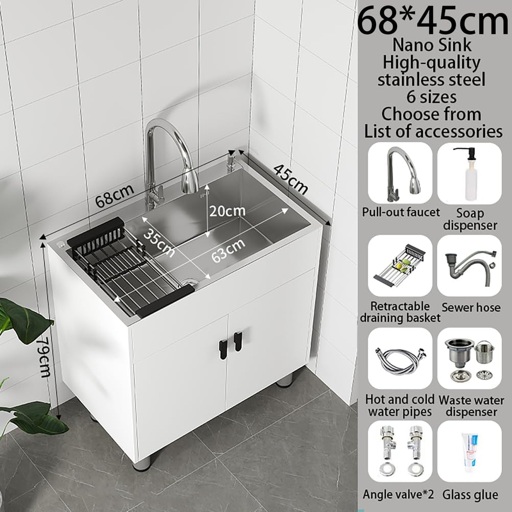 Products: MNUPUOL Freestanding Kitchen Sinks Color: white cabinet, silver sink Product material: thickened stainless steel, environmental protection bamboo board Installation: assembledSink depth: 20cm Product size: 50*40*79cm , 55*40*79cm , 60*45*79cm , 65*45*79cm , 68*45*79cm , 75*45*79cmProduct Features: 1.Sink one-piece molding, increase the deepening. 2.3.With sloping bottom and X-shaped guide line, the large-diameter drain has excellent drainage effect.3.Small R corner is easier to clean, each corner is carefully designed, with anti-odor drain, telescopic draining basket, mute cushion damping, quieter when using.4. Thickened stainless steel with nano-coating.5.The sink comes with a storage cabinet, built with eco-friendly bamboo panels, providing space for daily necessities and maximizing storage efficiency.Suitable for use in any kitchen, clean room, laundry room, basement, utility room, backyard, commercial use, etc. If you if you have any questions or concerns about the product, we will provide you with professional service, your satisfaction is our top priority.