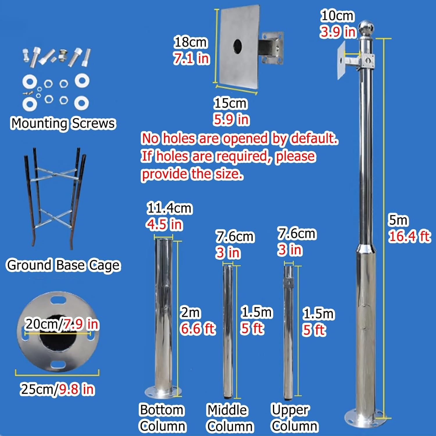 In today's dynamic environment, having a dependable security camera pole is essential for effective monitoring, whether it's in bustling city intersections, busy commercial areas, or serene park settings. Our stainless steel security camera pole serves as a robust support system for your surveillance equipment, providing not only exceptional stability but also peace of mind for your security needs. This pole is designed to enhance your security setup, making it an ideal choice for various monitoring scenarios.**Specifications:** - **Material:** Stainless Steel for durability - **Tube Wall Thickness:** 1.4 mm - **Upper Column Diameter:** 7.6 cm - **Middle Column Diameter:** 7.6 cm - **Bottom Column Diameter:** 11.4 cm - **Cross Arm Lengths:** A-10 cm, B-28 cm, C-30 cm**Available Heights:** - 2 m (6.6 ft): 2 Sections - 2.5 m (8.2 ft): 2 Sections - 3 m (9.8 ft): 3 Sections - 3.5 m (11.5 ft): 3 Sections - 4 m (13.1 ft): 3 Sections - 4.5 m (14.8 ft): 3 Sections - 5 m (16.4 ft): 3 Sections - 6 m (19.7 ft): 3 Sections**Features:** 1. Constructed from 2-3 sections for easy transport and installation. 2. Rust-proof stainless steel ensures long-lasting durability. 3. Sturdy design suitable for all weather conditions. 4. Versatile cross arms can be mounted on all sides, adaptable to varying needs. 5. Compatible with a wide range of monitoring equipment. 6. Ideal for outdoor locations such as roads, squares, and parks.**Package Includes:** - 1 x Security Camera Pole - 1 x Ground Base Cage - Mounting ScrewsEnhance your security infrastructure with our reliable security camera pole, designed to meet the demands of various environments while providing the stability and versatility you need for effective surveillance.