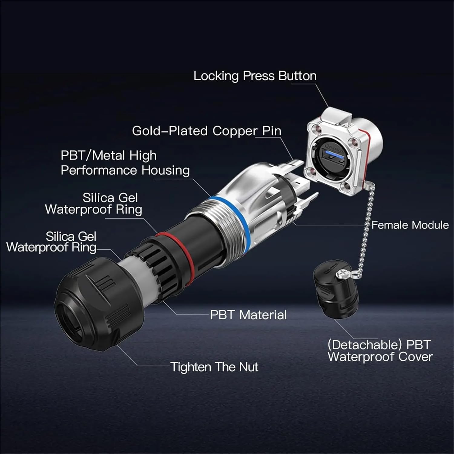 Electrical ConnectorM24 Waterproof USB3.0 Connector BD24 Metal USB Charging Data Fast Transimission Connector for Desktop Computer with 0.5m/1m Cable Features: Versatile CompatibilityThis connector is compatible with various desktop computers, making it a versatile choice for different devices.Metal ConstructionConstructed from metal, this connector provides robustness and longevity, ensuring a reliable connection over time.High-Speed USB3.0 InterfaceEquipped with a high-speed USB3.0 interface, this connector offers fast data transfer rates for efficient desktop computing.0.5m/1m Cable LengthWith a 0.5m/1m cable length, this connector offers flexibility in positioning, allowing for easy access and setup.Waterproof DesignThe M24 Waterproof USB3.0 Connector ensures reliable data transmission even in wet conditions, making it ideal for outdoor use.==========Hign-concerned Chemical : NoneModel Number : BD24-USB3-MP-MP-1M-002Durability(Min.) : 500 timesWorking temperature : -40 degrees Celsius-85 degrees CelsiusConnecting mode : Easy locking systemWaterproof cover : Silica gelFlammability rating : UL-94V0Termination : SolderingHousing&insulation parts : High-performance engineering plasticsCable Included : with 0.5m/1m cableMaterial : Zinc alloyDiameter range : 5.0~7.0mm