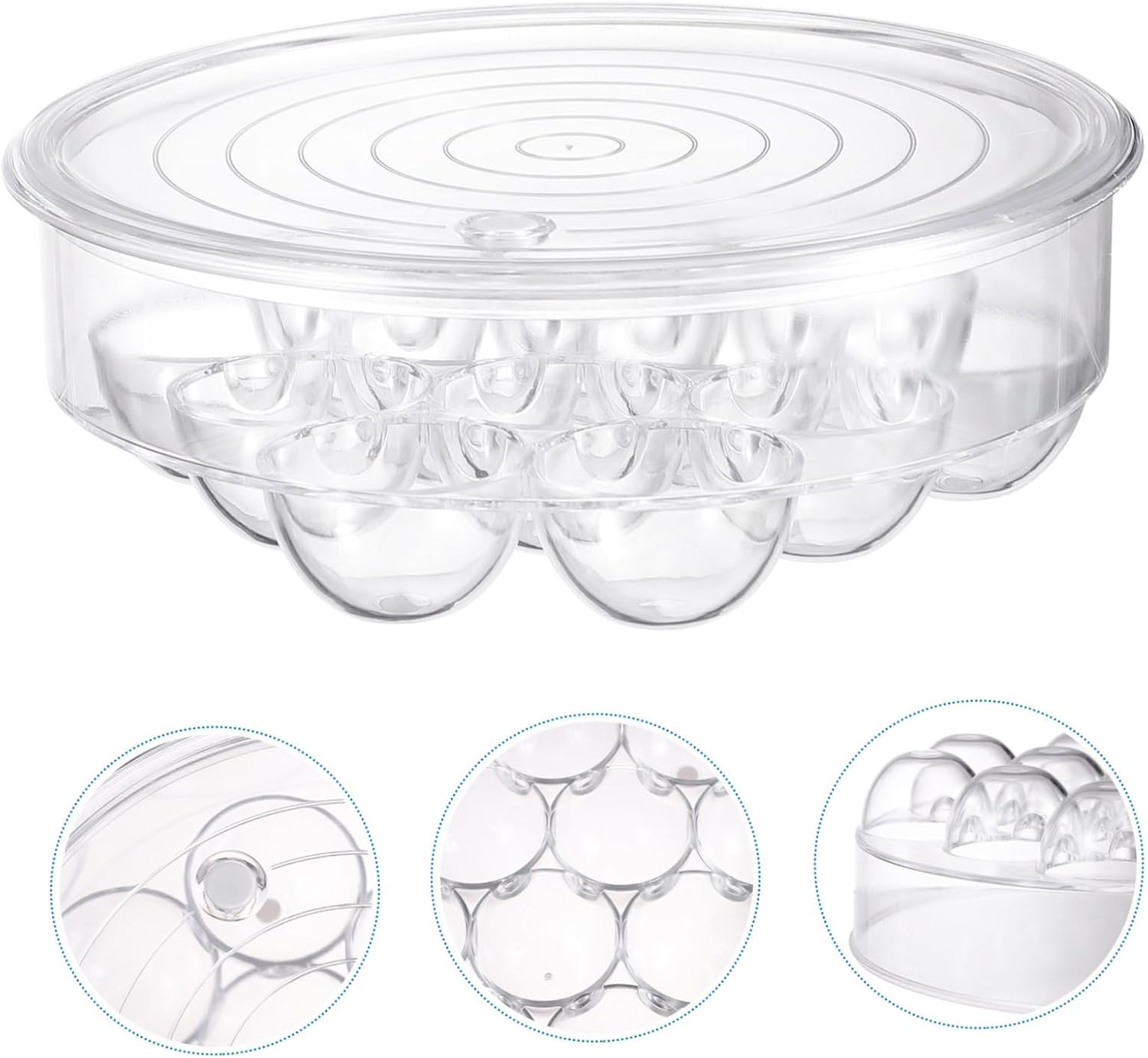Package Include 2 x egg boxCharacteristics -Color: Transparent flat storage bins with lids.-Material: Fridge Egg Storage Bins.-Size: About 21.5x21.5x7.5cm/8.45x8.45x2.95 inch Refrigerator Eggs Storage Container.-The slot has a deepened design, more stable Refrigerator Egg Bins.-Vertical groove design, stable placement round tray.-Anti-slip mat design, not easy to slide egg.-Large-capacity storage, can be stacked bulk egg flats.-Ventilation hole design, ventilation to maintain the internal fresh Refrigerator Egg Storage Bin.Goods Descriptionclear container It has the good workmanship details, you will use it for a long time.Plastic Fridge Egg Tray Lid cover , simple structure is sturdy and space-saving.plastic serving tray This egg container is made of material, it is durable and sturdy.egg tray for refrigerator It will make your refrigerator in order