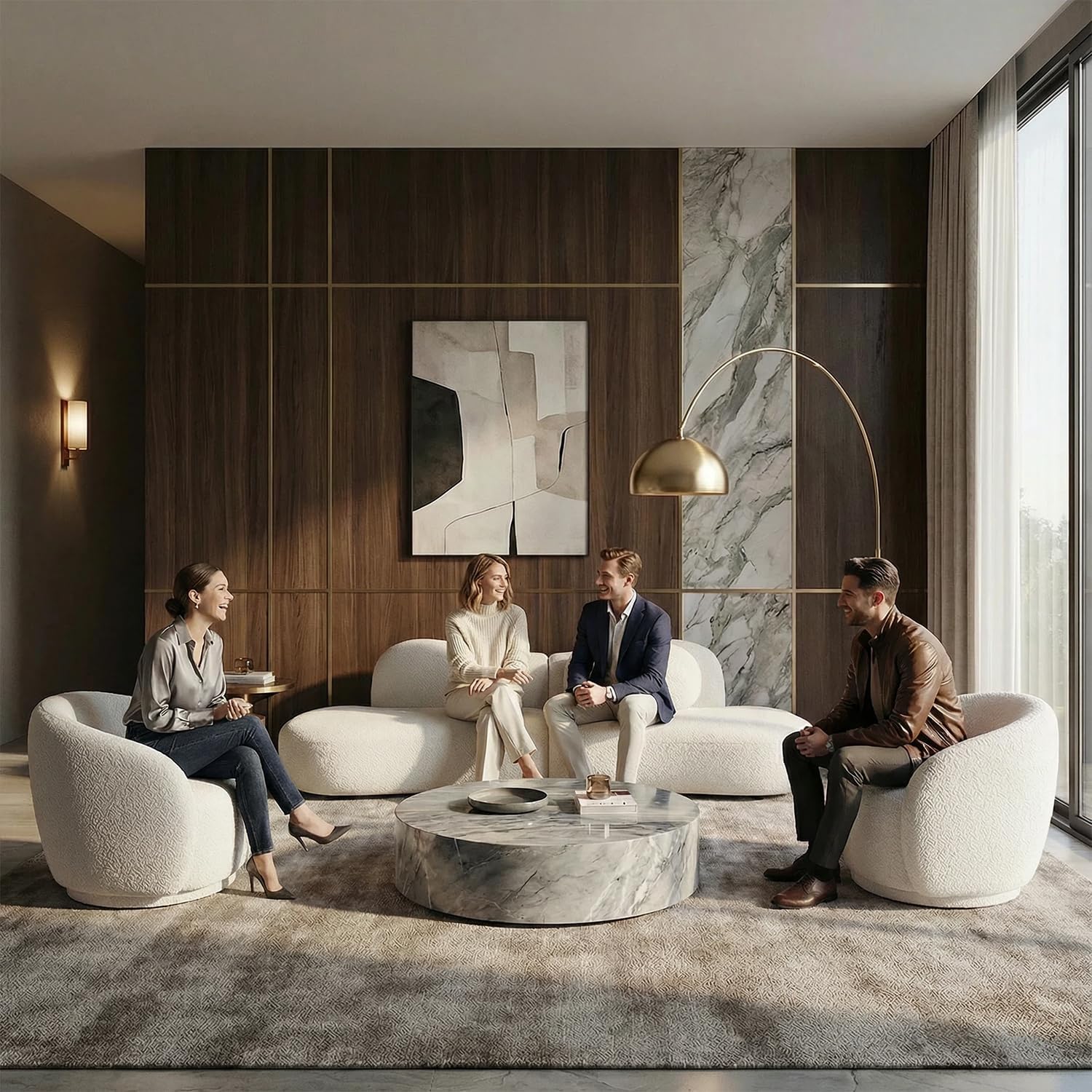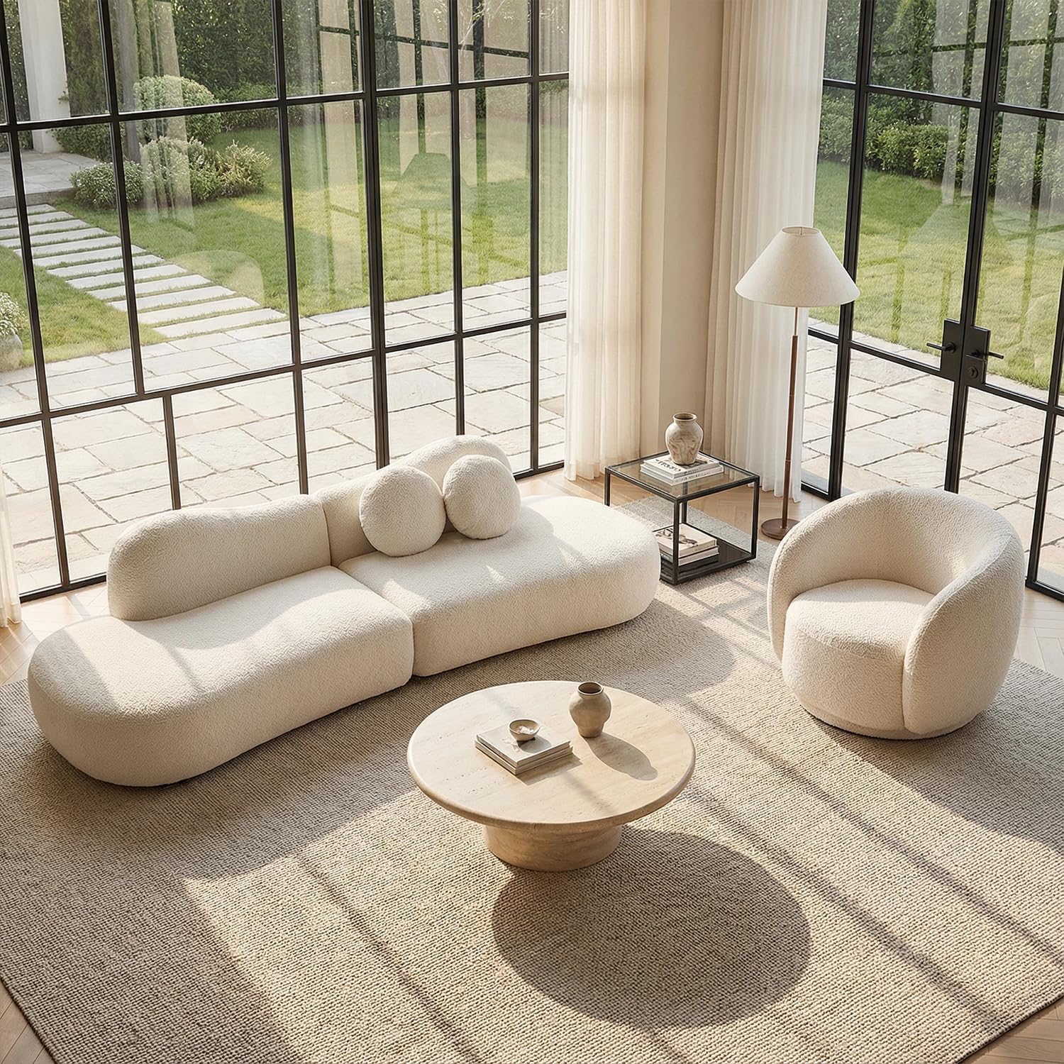 Redefine your living space with the refined balance of softness, structure, and modern elegance. The mr.waiba curved sofa set is designed for customers seeking both visual impact and everyday comfort. This 2 piece living room set includes a generously sized curved modern sofa and an oversized 360° swivel chair, forming a sophisticated sofa and chair set ideal for contemporary homes.Inspired by Japandi furniture aesthetics, this set blends Japanese minimalism with Scandinavian warmth. The smooth curved profile creates a welcoming flow, making it a standout choice among curved sofas for living room, luxury couches for living room, and modern sofa collections. Its sculptural silhouette elevates interiors ranging from apartments to spacious living rooms.Wrapped in premium bouclé fabric couch upholstery, the surface delivers a soft, tactile experience often described as a comfy sofa with cloud-like comfort. The textured boucle enhances depth and warmth, positioning this set as a boucle sofa for living room that feels inviting without sacrificing durability. The neutral sofa set white tone pairs effortlessly with modern, minimalist, and Japandi interiors.Built with a solid wood frame, the sofa set ensures long-term stability and support. The carefully engineered structure provides confidence for daily use, whether placed as a centerpiece living room furniture arrangement or styled as a luxury couch set for entertaining guests. This thoughtful construction makes it suitable as a 4 seater sofa configuration for family seating and relaxed gatherings.The oversized swivel chair rotates smoothly, adding functional flexibility while maintaining cohesive design. Together, the sofa and chair create a versatile couch set that adapts to different layouts, from open-plan living rooms to refined office lounges. For international households, it also fits seamlessly into spaces styled as juego de muebles, juego de sala, or juego de muebles para la sala modernos, offering universal appeal.Easy assembly allows you to enjoy your furniture quickly, with minimal setup required. Designed for those who value quality, comfort, and clean design lines, this set embodies a modern lifestyle statement—where luxury meets livability.Q&AQ1: What style does this sofa set belong to?A: This sofa set features a Japandi curved sofa design, combining Japanese minimalism and Scandinavian comfort. It fits modern, minimalist, and luxury interiors.Q2: Is the fabric soft and comfortable for daily use?A: Yes. The sofa is upholstered in premium bouclé fabric, offering a soft, cozy feel while remaining durable—ideal for customers looking for a comfy sofa or luxury couch.Q3: What materials are used for the frame?A: The structure is built with a solid wood frame, providing strong support, stability, and long-term durability.Q4: How many people can this sofa set accommodate?A: The curved sofa and swivel chair together function as a 4 seater sofa, comfortably seating family members or guests.Q5: Is assembly complicated?A: No. Assembly is simple and quick, designed for easy setup without professional tools. If assistance is needed, our dedicated support team is ready to help.Q6: Does this sofa set suit modern living rooms?A: Absolutely. It works perfectly as modern sofas for living room, luxury sofas for living room, or a refined curved boucle sectional couch alternative.