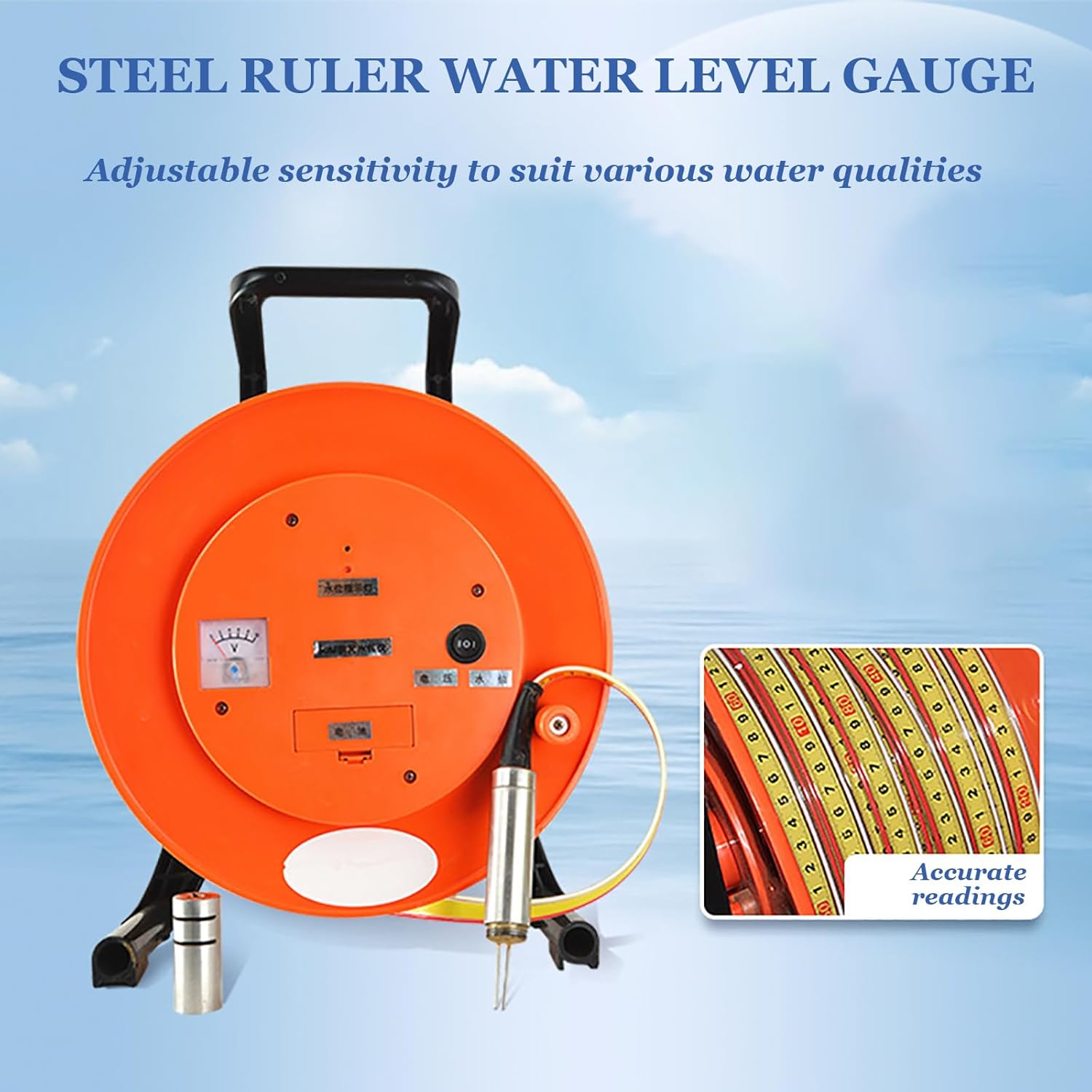 PRODUCT OVERVIEW: The steel ruler water level meter provides a method for measuring water level. It is usually used to measure the water level in wells, boreholes and water level pipes. It is particularly suitable for observing the groundwater level in hydropower projects or for manual inspection of the dam body infiltration line of earth-rock dams. PRODUCT INFORMATION: Product name: Steel ruler water level gauge Measurement depth: 10/20/30/50/100/150/200/300/500 meters Minimum reading: 1mm Repeatability error: ±0.2mm Applicable temperature of the instrument: -20℃~+60℃ Working voltage (V): DC=9 Battery: 9V (6FF22, 9V laminated dry battery) Product size (height*width): 450mm*310mm Probe size: water level gauge 150mm*25mm INSTRUCTIONS FOR USE: When measuring, let the winding reel rotate freely, press the power button, put the probe into the water level pipe, hold the steel ruler cable, and let the probe move slowly downward. When the contact point of the probe touches the water surface, the sounder of the receiving system will emit a continuous buzzing sound. At this time, read the depth dimension of the steel ruler cable at the pipe mouth, which is the distance of the groundwater level from the pipe mouth. NOTE: 300-500 meters are all customized.