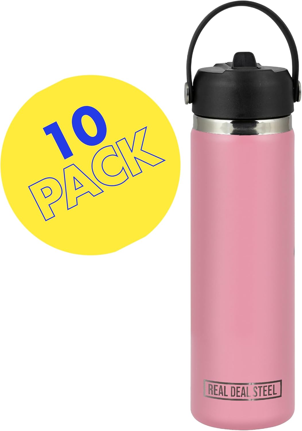 Stainless Steel Insulated Water Bottles by Real Deal Steel. They come in many colors and sizes including pink, black, purple, blue, red, yellow, orange, teal, ocean blue. Includes upgraded carry strap and straw cleaner. Thermos style keeps ice for days, if needed.