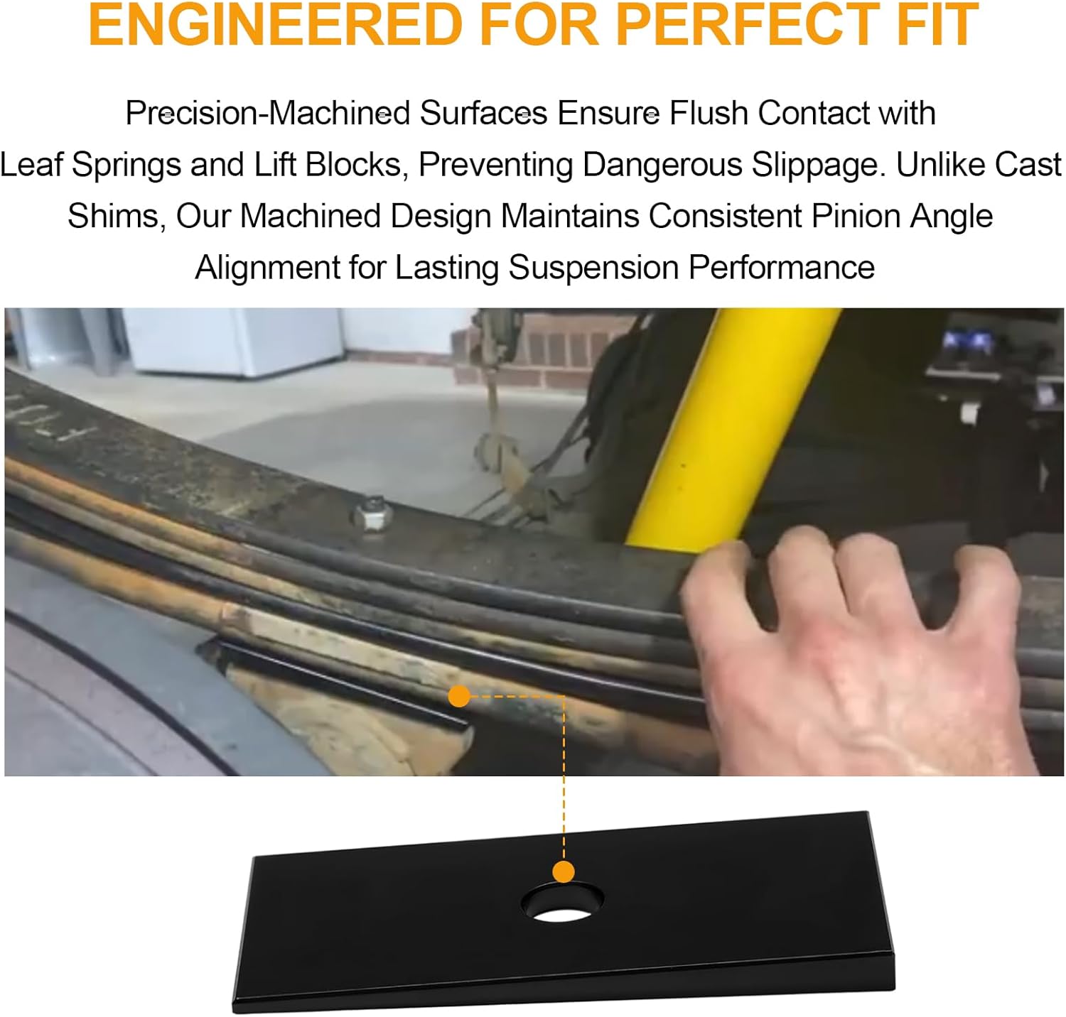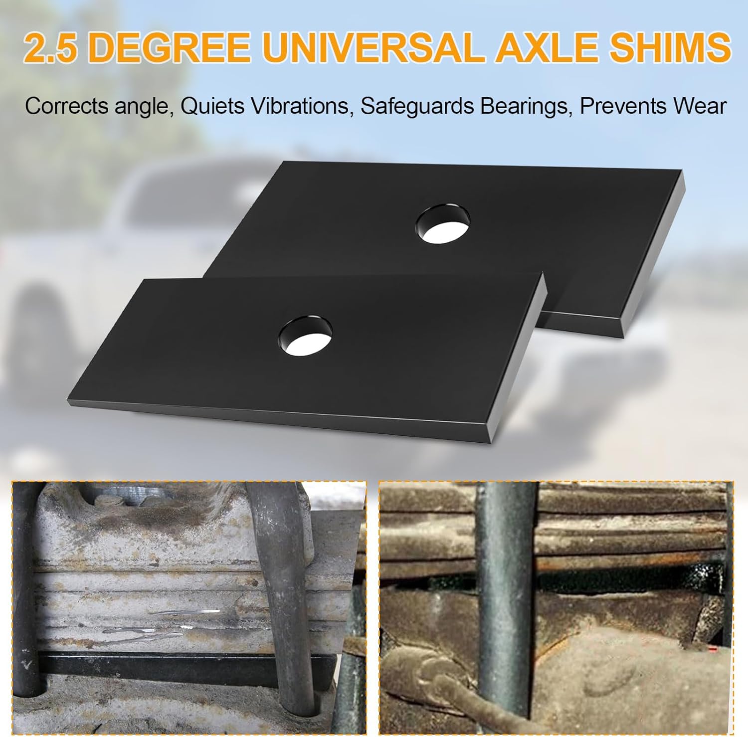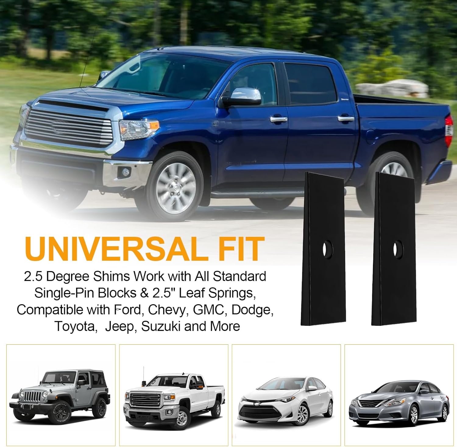 2.5 Degree Universal Axle Shims for Leaf Springs & Lift Blocks, Angle Correction Wedges Fit Standard Single-Pin Blocks & 2.5" Springs, Correct Pinion Angle and Reduce Driveline Vibration 🎀Specification: Material: High-Quality Aluminum Pack Include: 2* 2.5 Degree Shims 🎀Universal Fit: 2.5 degree shims work with all standard single-pin blocks & 2.5" leaf springs, compatible with Ford, Chevy, GMC, Dodge, Toyota, Jeep, Suzuki and more 🎀Universal Fit: ✔ Corrects 2.5° pinion angle ✔ Eliminates driveline vibrations ✔ Protects differential pinion bearings ✔ Prevents premature drivetrain wear