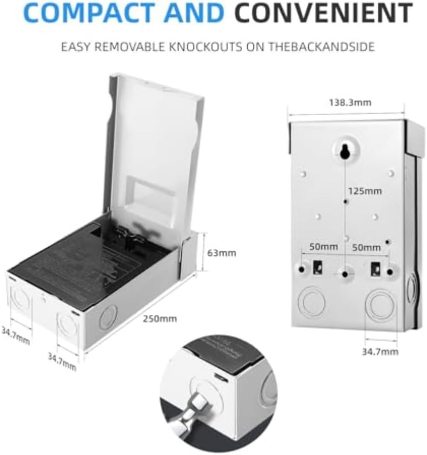 Features:*Efficient Electrical Handling: Designed with a 30A 120V 240V, single-phase, 3-wire, 2-pole switch, this AC disconnect switch excels in managing electrical loads effectively, optimal performance in air conditioning applications. *Weatherproof Protection: Crafted from premium galvanized steel, the all-metal enclosure is specifically engineered to withstand outdoor conditions, providing superior resistance to rain, dust, and rust for lasting durability. *Convenient Pull Out Mechanism: The switch features a user-friendly pull-out design that allows for effortless onoff control through a securely stored handle, eliminating the risk of misplacement while enhancing usability. *Enhanced Security Features: The disconnect box includes a lockable design with a dedicated lock hole, allowing for added protection against unauthorized access and peace of mind in various installation environments. *Simple Installation Process: With pre-drilled knockout holes for easy wiring and ample space for connections, this outdoor AC disconnect switch is perfect for both DIY enthusiasts and professionals looking for a hassle-free setup. Specifications:*Part Name:30 Amp Outdoor AC Disconnect Switch*Material:Metal*Size:250*138mm*Color:grey*Casing material: Galvanized steel *Waterproof rating: IP33Package Content:1*30 Amp Outdoor AC Disconnect Switch