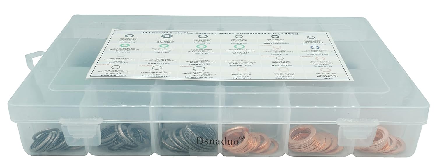 20PCS Size: 20.3x11.8mm Replace: 097-119 Fits M12 (20Mm Od) ; 10PCS Size: 25.7x10mm Replace: 097-115 Fits M12 (25Mm Od); 20PCS Size: 21.7x13.5mm Replace: 097-139 Fits M14; 10PCS Size: 19.3x14mm Replace: 097-146 Fits M14 ; 20PCS Size: 24.7x11.5mm Replace: 097-021 Fits 1/2, M12, M12 So; 20PCS Size: 24.7x13.5mm Replace: 097-025 Fits 1/2Do, 9/16, M14; 15PCS Size: 23.7x12.4x2.0mm Replace: 90430-12009, 097-127 Fit: 1/2, M12 So 15PCS Size: 23.8x14.2x2.0mm Replace: 097-128 Fit: M14 M12 D.O; 10PCS Size: 26.9x16.2x2.0mm Replace: 097-129 Fit: 1/2To, 5/8, M14 So, M16; 10PCS Size: 28.7x18.6x2.0mm Replace: 90430-18023, 097-130 Fit: M18, 3/4, M16.4; 15PCS Size: 17x11x3mm Replace: 11026-01M02, 090-134 Fit: M12; 15PCS Size: 20.9x12.2x1.9mm Replace: 90430-12031, 095-156 Fit: Toyota; 15PCS Size: 22x12x1.4mm Replace: 90430-12027, 095-143 Fit: M12; 15PCS Size: 20x14x1.5mm Replace: 21513-23001, 095-147 Fit: M14; 15PCS Size: 22x14x2mm Replace: 94109-14000, 095-015 Fit: 1/2Do, 9/16, M14; 15PCS Size: 24x18x2mm Replace: 90430-18008, 095-149 Fit: 11/16, 11/16So, M18; 10PCS Size: 19.9x14.2mm Replace: N0138157 Fit: VW, Audi; 10PCS Size: 22x16x2.0mm Replace: 11137546275 Fit: BMW, Mini; 10PCS Size: 19x14.2mm Replace: MD050317, 095-141 Fit: 1/2So, M14; 10PCS Size: 25.9x20.1mm Replace: 11126-AA000, 095-142 Fit: 3/4So, 13/16, M20; 10PCS Size: 20x14x1.5mm Replace: 097-135 Fits M14, 9/16; 10PCS Size: 22x14x1.5mm Replace: 095-019 Fits M14, 9/16; 10PCS Size: 22x16x1.3mm Replace: 095-154 Fits 5/8, M16, M16.4