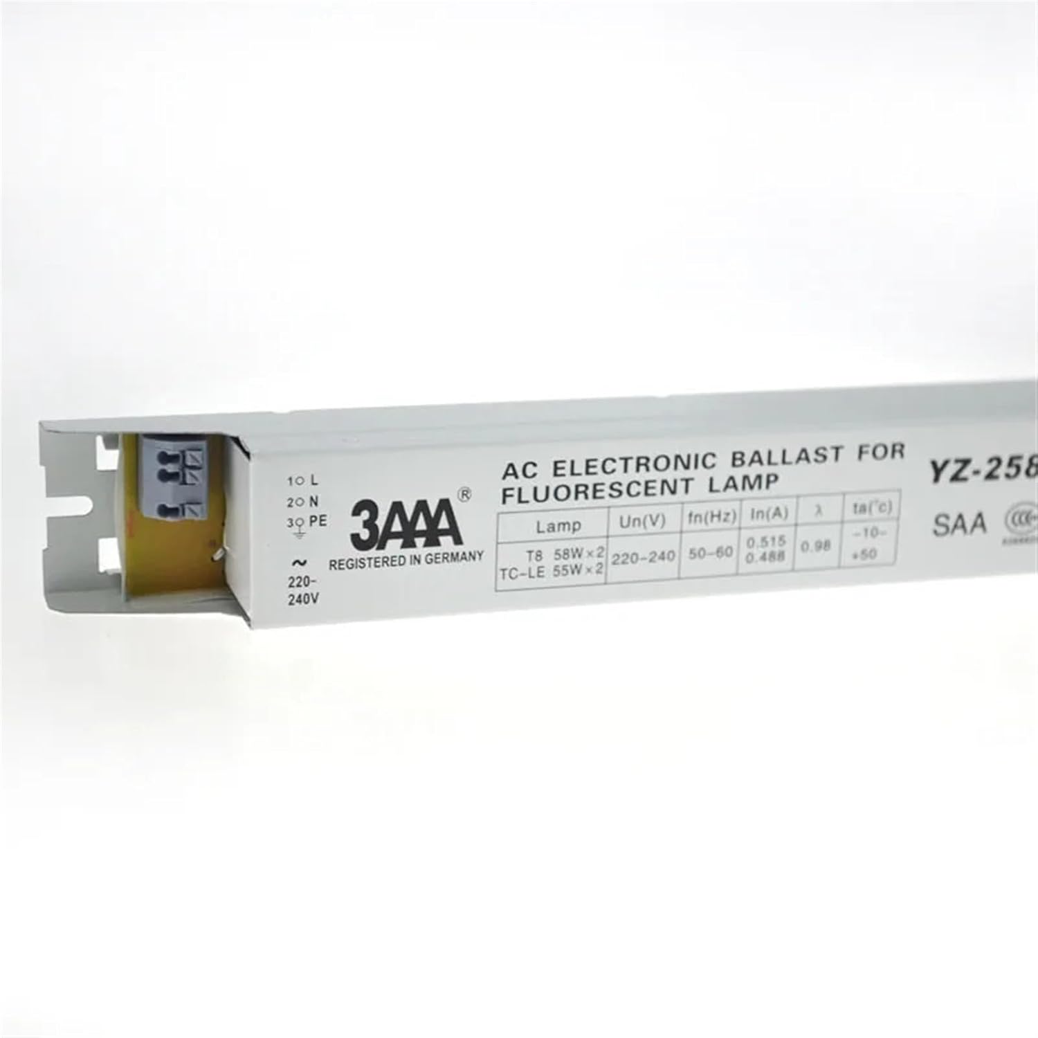 BallastsElectronic ballast: YZ-158EAA T8/TC-LApplicable lamp: T8 58W*1Startup method: non-hot startPower factor: 0.98Power supply voltage: AC220-240VWorking voltage range: 198-254VWorking frequency: >2kHz