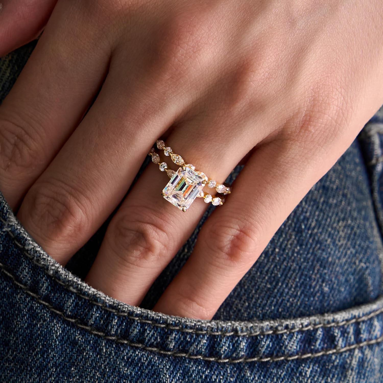 This exquisite bridal ring set features a 3-carat emerald-cut center stone with a brilliant "hall of mirrors" sparkle, blending classic elegance with modern flair. Crafted from skin-friendly 925 sterling silver with platinum plating, it boasts meticulous workmanship for long-term wear. The timeless rounded rectangular design complements both casual and formal attire, making it perfect for engagements, anniversaries, birthdays, or self-gifting as a symbol of love and commitment. Each GRA-certified ring (D color, VVS1 clarity) undergoes strict quality inspection to ensure superior finish and customer satisfaction.