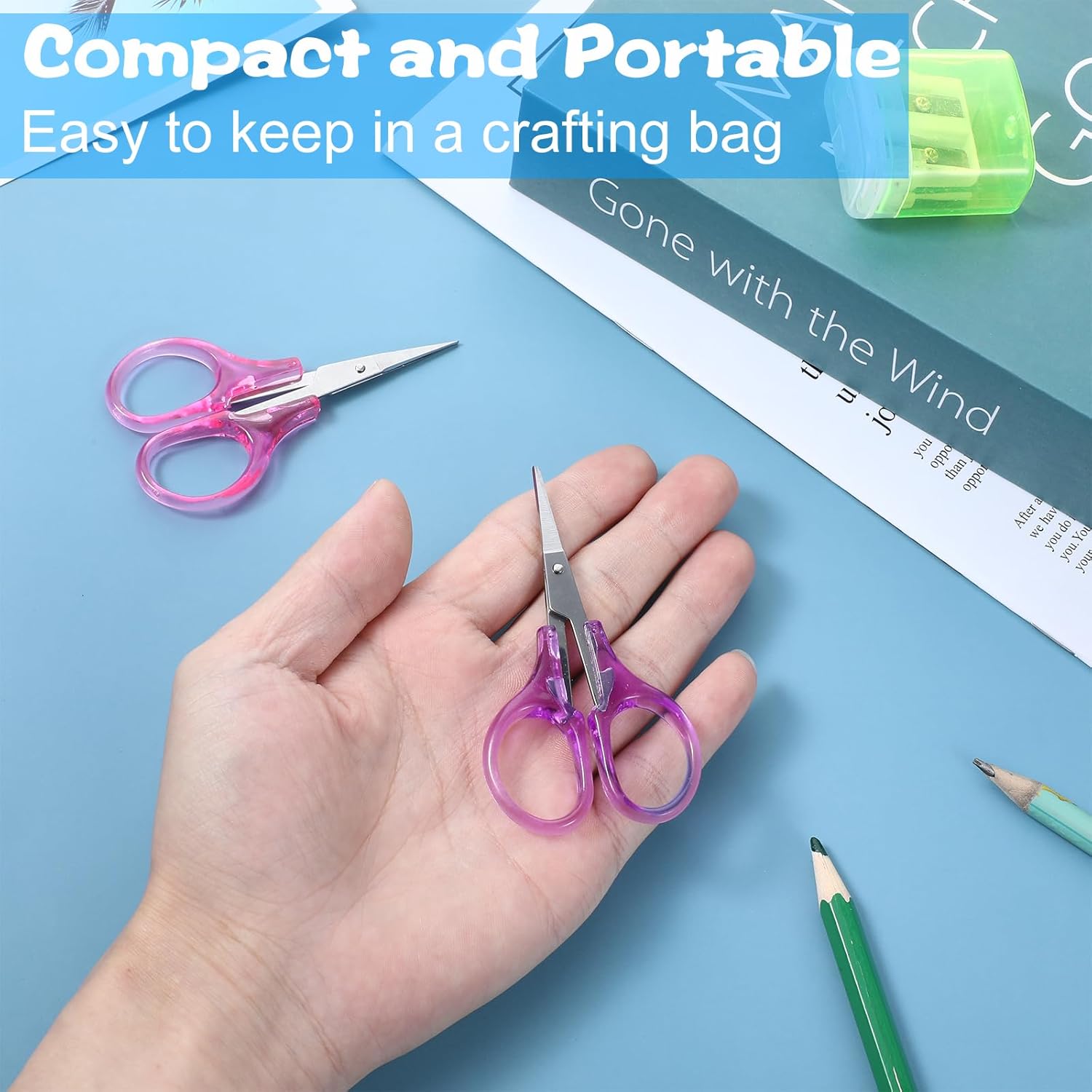 Product name: 4pcs mini scissorsProduct style: simpleProduct color: Purple, orange, pink, blueProduct material: plastic, stainless steelSingle product size: 8.5cm*4.5cmProduct Usage: The size of small scissors with cover is great for cross stitch, embroidery, knitting, sewing, thread, fabric, yarn cutting, crocheting Etc. Very stylish and with cover for safety and easy storage. Very functional & cuts very clean even the hard to reach places ! Perfect for handwork projects and for storing them in the purse or craft box.
