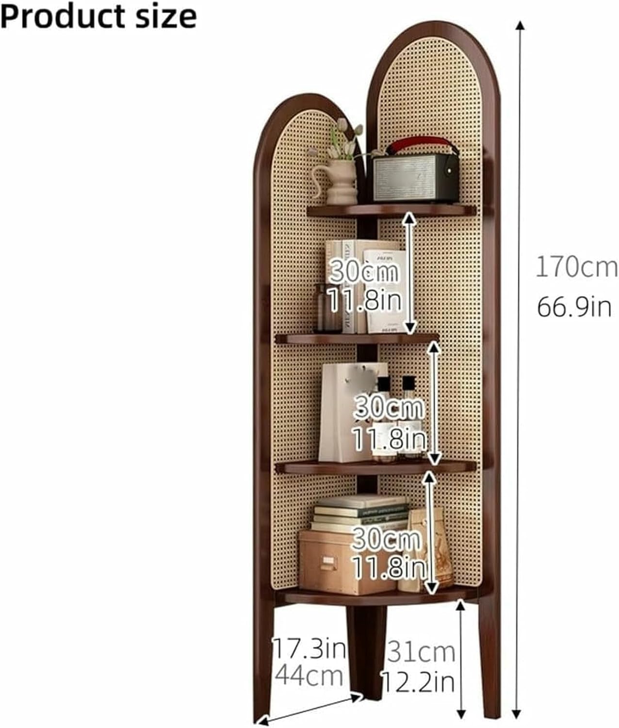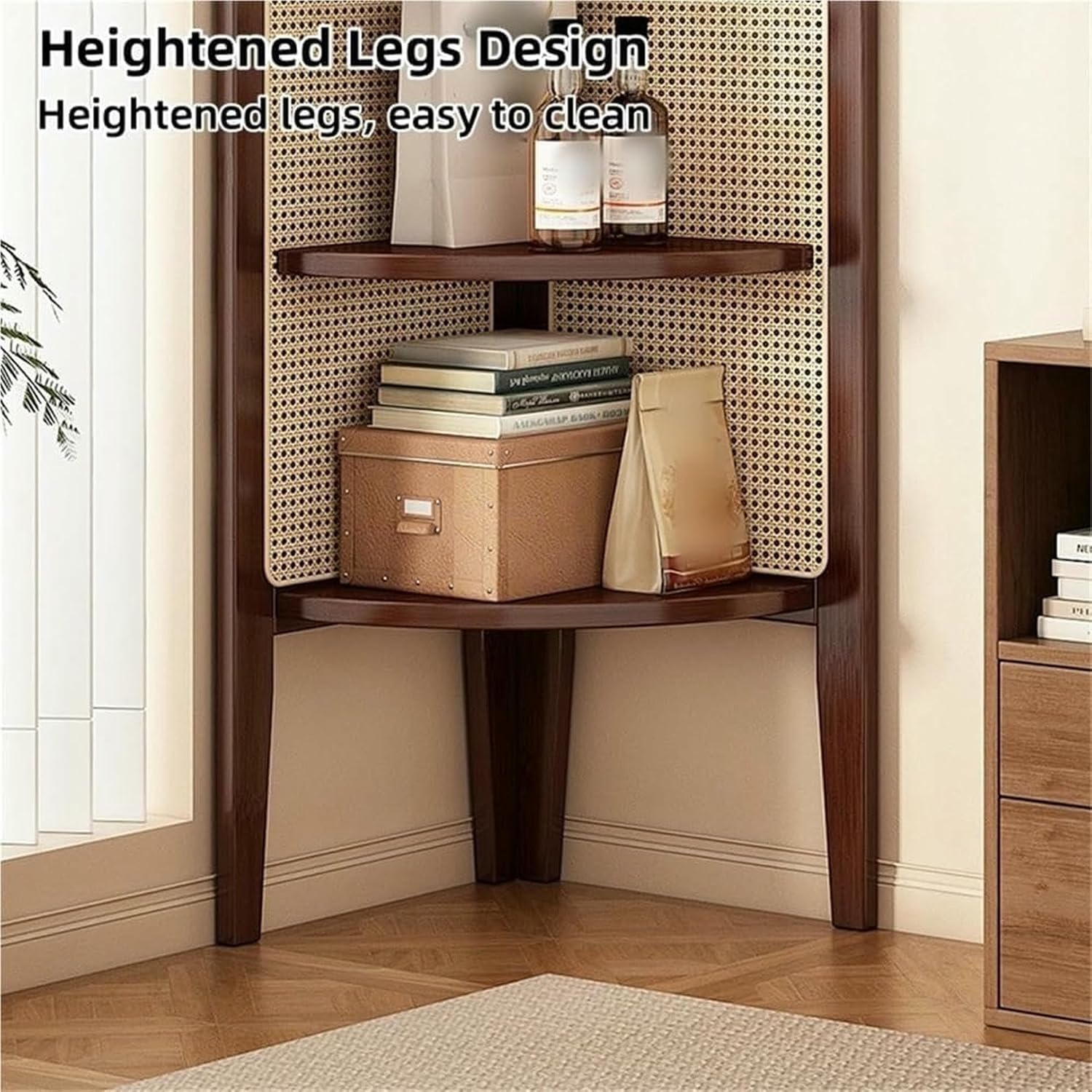 This 4-tier corner shelf stand, made from resilient plastic rattan, seamlessly blends classic woven aesthetics with modern functionality, making it an excellent choice for optimizing space in bedrooms, living rooms, studies, or offices. The thoughtfully designed triangular base provides stability, ensuring that your items remain securely in place. Its 4-tier layout is perfectly suited for tight 90° corners, transforming previously unused areas into valuable storage solutions for books, plants, or decorative accents. **Product Name:** Corner Bookshelf **Style:** Modern and Minimalist **Materials:** Bamboo/Rattan **Package List:** 1 x Corner Shelf **Assembly:** Some assembly required **Usage Tips:** 1. Please note that product dimensions are manually measured, and a slight variation of 1-3CM may occur. 2. Color variations may exist due to different monitor displays, so we recommend checking the actual product for true colors. 3. For any inquiries or assistance regarding the product, please feel free to reach out, and we will be happy to help you promptly. Enhance your space with this stylish and practical corner shelf, designed to elevate both organization and decor while complementing your modern lifestyle.