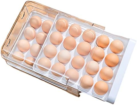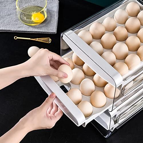 egg holder can store 40 grid eggs. It features two drawers, each drawer 20 eggs, which can help you organize new and older eggs, fresh and boiled egg in different layer. Dimension: 10.8" L x 8.6" W x 5.9" H. The fridge egg container has a solid top to use as a shelf, and it is stackable, saving space in the refrigerator, helps keep things organized and handy. Made of food grade PP material, eco-friendly, BPA-free, sturdy thickness and durable, protecting your egg from getting smack or cracked. It is clear enough to see how many eggs left-never run out of eggs. The eggs holders are extremely handy, just slide a tray out and choose which eggs to use. The drawers glide in and out with ease. Note that the eggs in the product picture are not included, it is recommended to buy two sets of more suitable Product DescriptionThe ideal egg organizerThe ideal egg storage box can be placed on the kitchen countertop for your convenience, or refrigerated in the refrigerator to better keep the eggs fresh. 40 card slotsEach card position is mostly produced according to the shape of the egg, which has better protection to the egg,One box has two layers, one layer has 20 card slots, a total of 40 card slots drawer storageDrawer storage is more convenient and will not cost more space refrigerator storageIt can be placed in the refrigerator or on the stove, and it is better to protect the eggs from being crushed by other things CapacityOne layer can hold 20 eggs. The deepened storage groove can store most eggs without worrying about the problem that the eggs won't fit. spaceThe egg storage boxes can be overlapped for better space utilization take outThe egg storage adopts a drawer type, which is convenient for better retrieval and will not be pressed by other items, causing the eggs to be damaged.