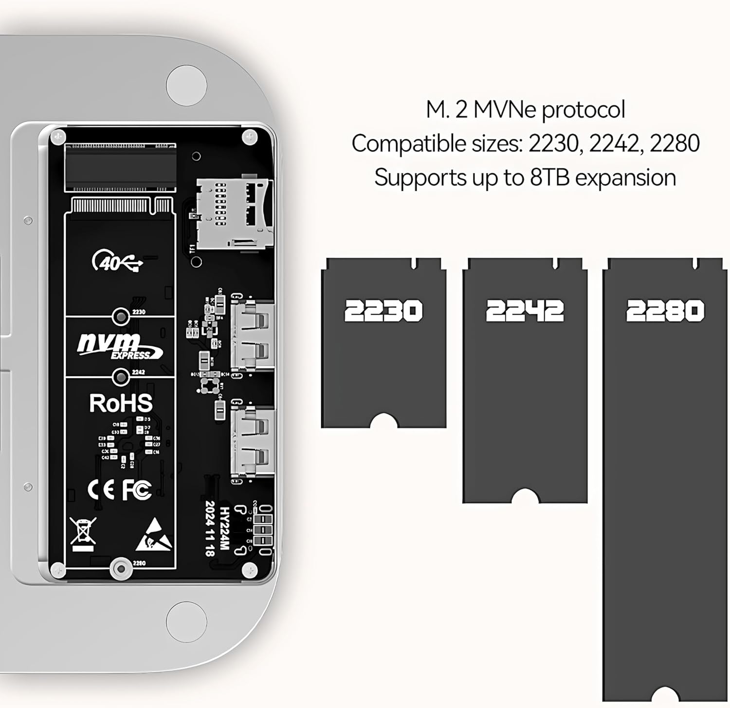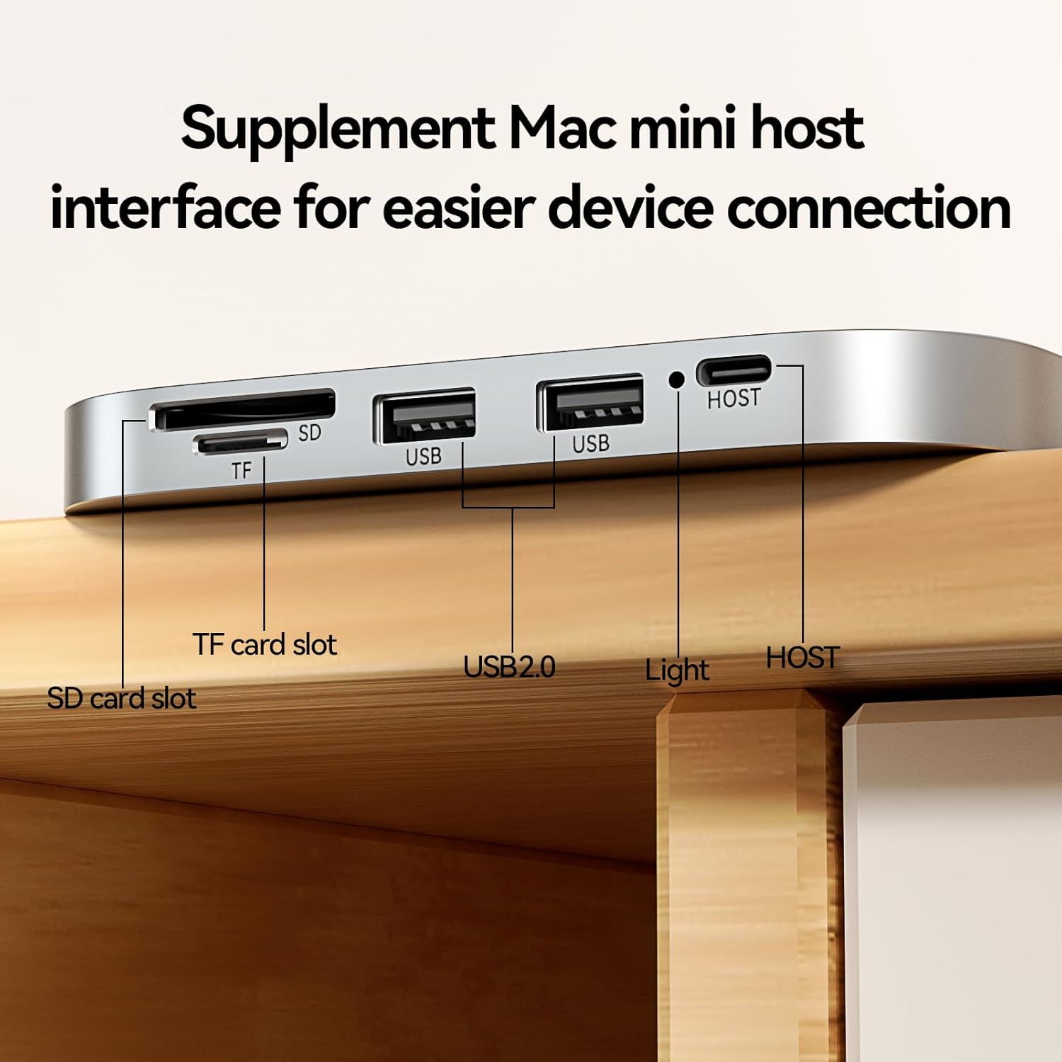 Unleash the full potential of your Mac mini with this versatile 5-in-1 USB4 expansion dock from Reletech. Featuring blazing-fast 40Gbps data transmission rates, this hub is perfect for creative professionals and power users. The precision-crafted CNC aluminum alloy housing integrates seamlessly with your setup while supporting massive storage expansion up to 8TB via M.2 NVMe protocol (compatible with 2230, 2242, and 2280 sizes). The thoughtfully designed interface includes SD and TF card slots, dual USB 2.0 ports, and a dedicated host connection, making it ideal for connecting multiple devices. Whether you're editing videos, managing large files, or running resource-intensive applications like Adobe Creative Suite, this dock delivers reliable performance. Its wide compatibility extends beyond Mac mini to laptops, desktop computers, and even gaming consoles, making it a versatile addition to any workspace. The sleek silver finish and compact form factor complement your existing hardware while maximizing connectivity options.