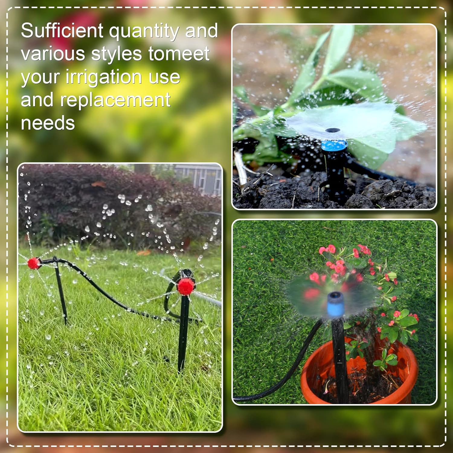 Features: Easy to operate: The water sprinkler head is easy to operate, make sure the hose is softened before connecting, soak the end of 1/4" tubing in hot water before attaching to the dripper, a firm push with a little added wiggling gets the hose on with sprinkler, then water will slowly emit and automatically watering your plants, you can water different plants according to actual needs they need, making life more convenient. Save your time and water: Sprinkler drip head can rotate 360 degrees to irrigate your plants, which can save a lot of water and does not require you to spend a lot of time and effort to look after it. Specifications: Material: plastic Color: red, green, black, blue Size: 5.2 inches in height Package includes: 500 Pieces drip irrigation emitters Notes: Manual measurement, please allow slight errors on size. The color may exist a slight difference due to different screen displays. Pointed parts included, please keep away from little kids and be careful when using.