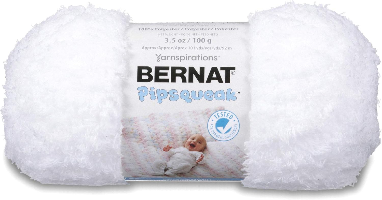 Bernat Pipsqueak Yarn. A soft chunky weight yarn that knits and crochets up quickly. Ideal for kids and babies. Weight category: 5. Content: 100% polyester. Put-up: 3. 5oz/100g, approximately 120yd/109m. Gauge: knit: 11st x16r = 4in/10cm on size US9/5. 5mm needles, crochet: 9sc x 12r = 4in/10cm on size I9/5. 5mm hook. Dyelotted: we try but are not always able to match dye lots. Care: machine and dry, do not bleach, do not iron, dry cleanable.