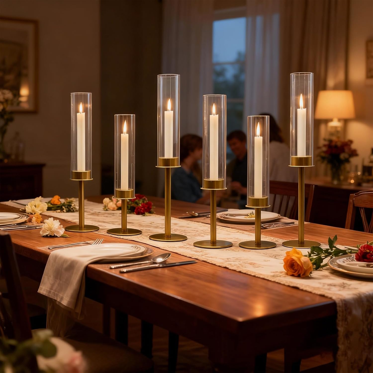 Create stunning visual impact with this 6-piece gold hurricane candle holder set. Designed to blend timeless elegance with practical functionality, each holder features a durable gold metal base topped with a clear glass cylinder to protect candle flames from drafts. The set includes: 14", 16", and 18", allowing you to craft beautifully layered tablescapes for any occasion.Crafted with careful attention to detail, the elegant matte gold finish ensures long-lasting beauty without tarnishing. Whether you're hosting a wedding, setting a romantic dinner ambiance, decorating for Halloween, or simply adding warmth to your living space, these versatile holders adapt effortlessly.Ideal as a gift or for your own home, this set arrives ready to impress—no assembly needed. Pair them with taper candles to transform any table, mantel, or patio into a captivating display of light and style.Crafted from durable, weather-ready materials and delivered in beautiful gift-ready packaging, this set is perfect for celebrations all year round. It also makes a thoughtful and luxurious gift for weddings, housewarmings, holidays, or anyone who loves to entertain with style.