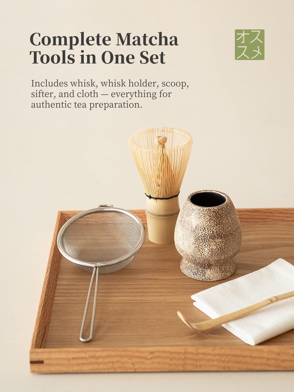 | Included Components | Bamboo Whisk & Scoop, Matcha bowl, Sifter, Tea Towel, Whisk Holder |