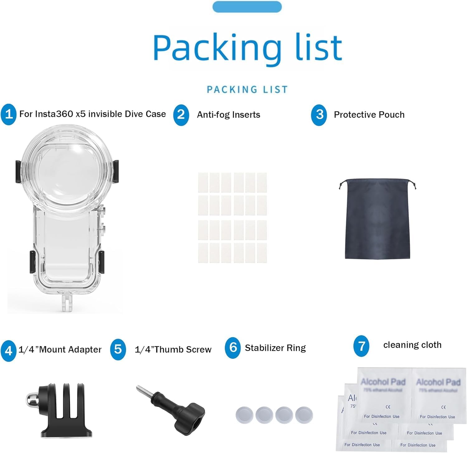 | BuiltIn Media | 1 x diving case, 1 x invisible base, 1 x storage bag, 24 x anti-fog sheets, 3 x alcohol cotton pads |