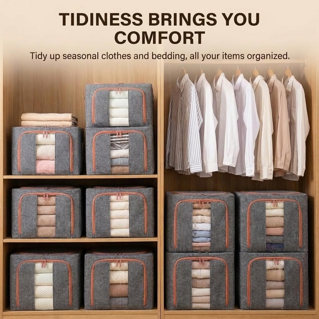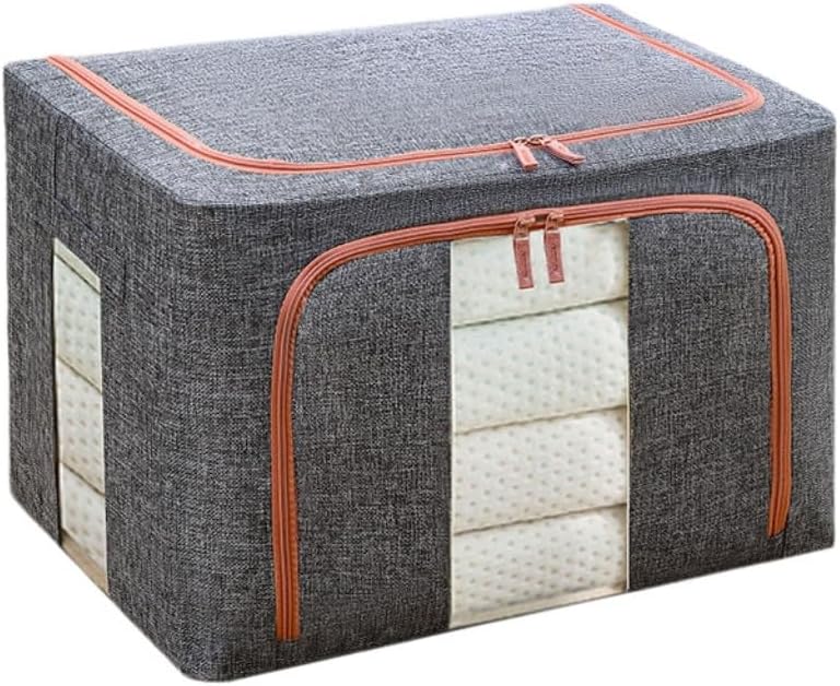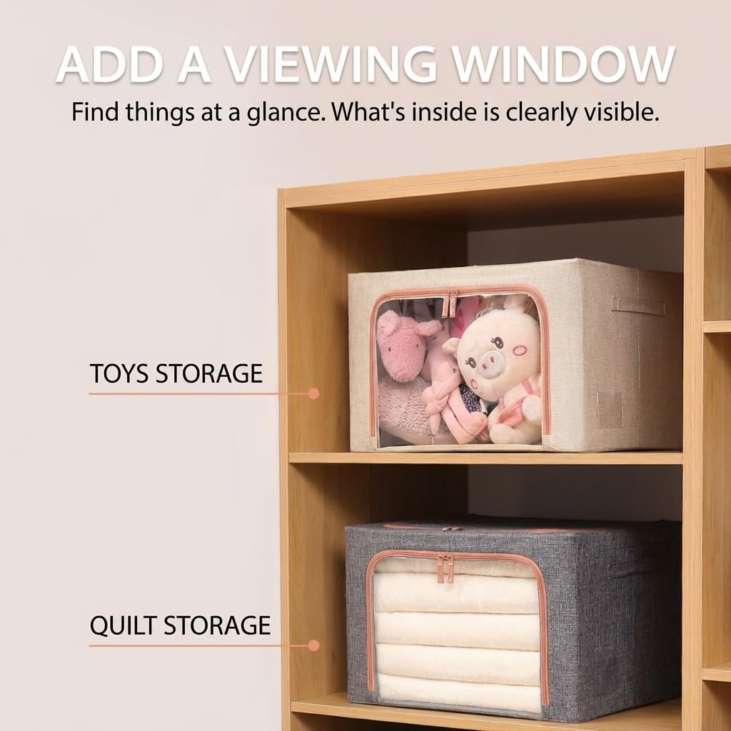 Designed for home organization, these 66L large storage bags feature a durable steel frame for sturdy support and a collapsible design for easy storage when not in use. The clear window on the front allows quick content identification, while double zippers provide smooth and convenient access. Made from premium cotton linen material, they are suitable for storing blankets, comforters, clothes, and other household items. Ideal for bedroom closets, wardrobes, and dorm rooms