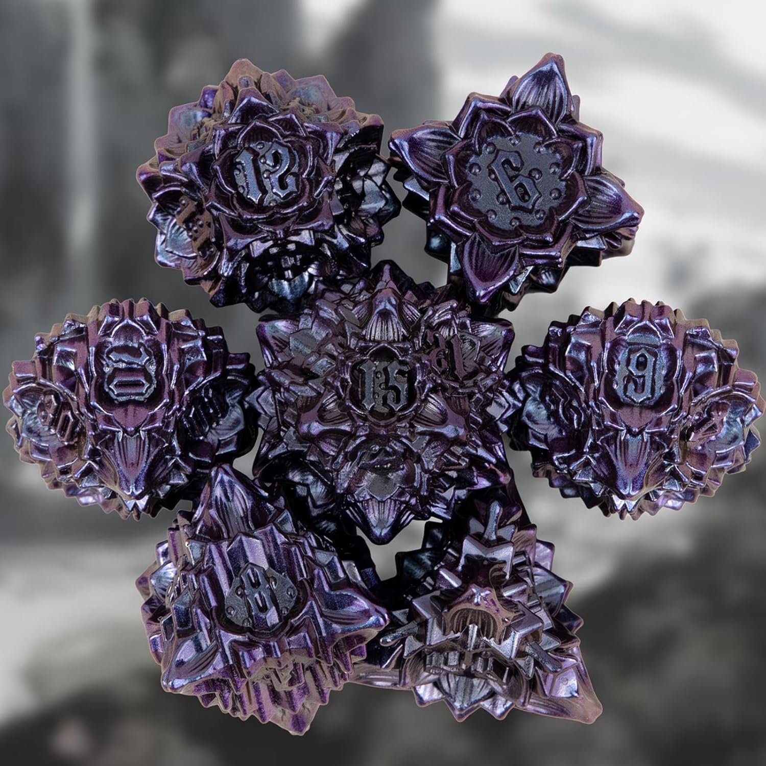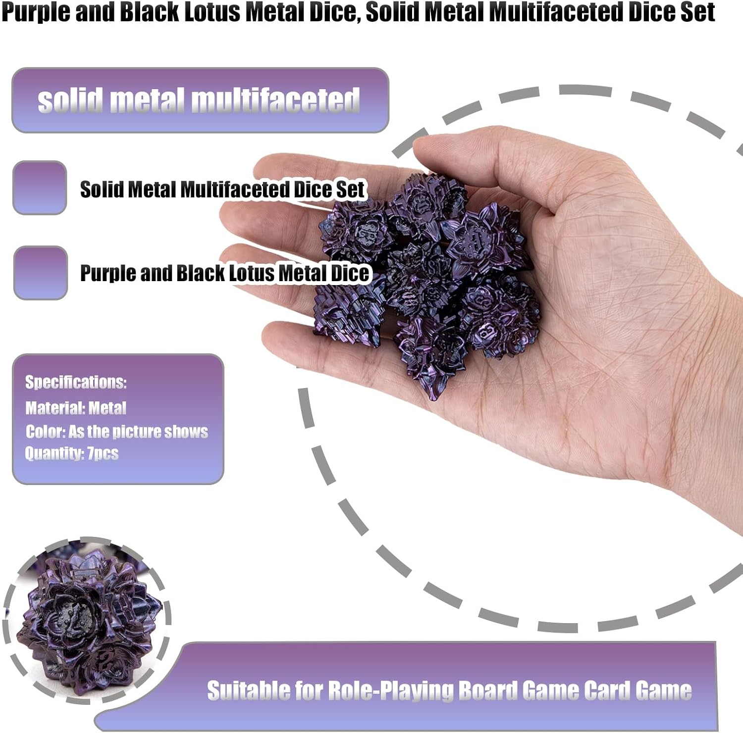 Description:NEW STYLE: This is the Purple Lotus Metal Dice. These dice are eye catching and can get lots of compliments at the table.GREAT IN HAND: There are bigger but lighter than metal dice .The weight of the Dice set is only 185g/6.53oz.Specification:Specifications:Material: MetalColor: As the picture showsQuantity: 7pcsPackage Includes:1 Piece 4 Surface Sieve1 Piece 6 Surface Sieve(1-6)1 Piece 8 Surface Sieve(1-8)2 Piece 10 Surface Sieve(0-9/00-90)1 Piece 12 Surface Sieve(1-12)1 Piece 20 Surface Sieve(1-20)1 Piece tray