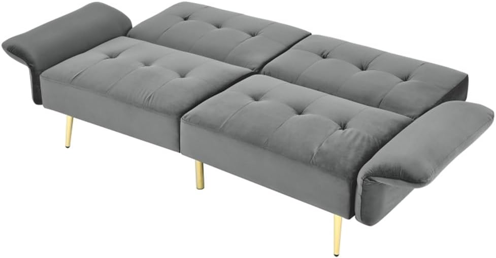 77.5 length when its armrests are folded down to adapt an adult sleeping. You don't need to bend your legs or put feet outside the sofa to suit for limited sofa width.filling foam in armrests makes it softer. It is comfortable enough for when sleep on. You do not need to prepare extra pillows.Storage bags are set on the outside of armrests. It is a very practical design that you can put the TV remote controller, magazines or some others in it.The backrests are foldable into 3 positions. The left and right backrests are controlled independently to meet different needs when you sit on it with your friend.The gold stainless feet are trendy . It can be perfectly match various living room styles.Cover Material:280G velvetFilling:FoamFrame type:Solid Wood + PlywoodLeg type:MetalWeight Capacity:600LBSSize: as shownSet Includes1*sofa(no other presentation items included).Notice:1. Due to manual measurement, please allow 2-3% error, before you bid, please make sure you don't mind.2. The color may vary due to different displays, please refer to the actual product.