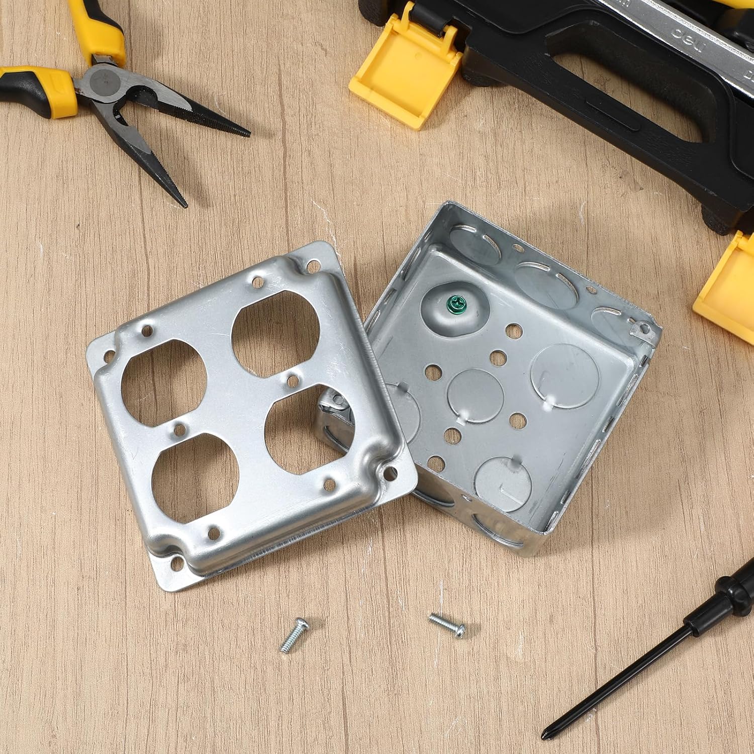 Upgrade your electrical projects with our professional 8-Set Electrical Junction Box with Cover package. Designed for durability and versatility, each 4x4 inch junction box is constructed from high-quality galvanized steel, offering exceptional strength and corrosion resistance for long-term reliability. With a substantial 21.0 cubic inch capacity and a standard depth of 1-1/2 inches, this box provides ample space to safely house wires, connectors, and devices. The design includes multiple strategically placed knockouts for easy cable entry and a tidy wiring setup. The included double duplex receptacle covers complete the installation with a sleek, silver finish. Whether you're a contractor tackling a commercial job or a homeowner managing a renovation, this complete set delivers the quality and components needed for efficient, code-compliant electrical work.Specifications:Material: Galvanized SteelColor: SilverBox Dimensions: 4 x 4 inches, 1-1/2" DeepCapacity: 21.0 Cubic InchesType: Square, Non-Metallic (NM) Cable CompatiblePackage Includes:8 x 4" Square Galvanized Steel Junction Boxes8 x Double Duplex Receptacle CoversNote: Always check local electrical codes before installation. Slight variations in measurements may occur.