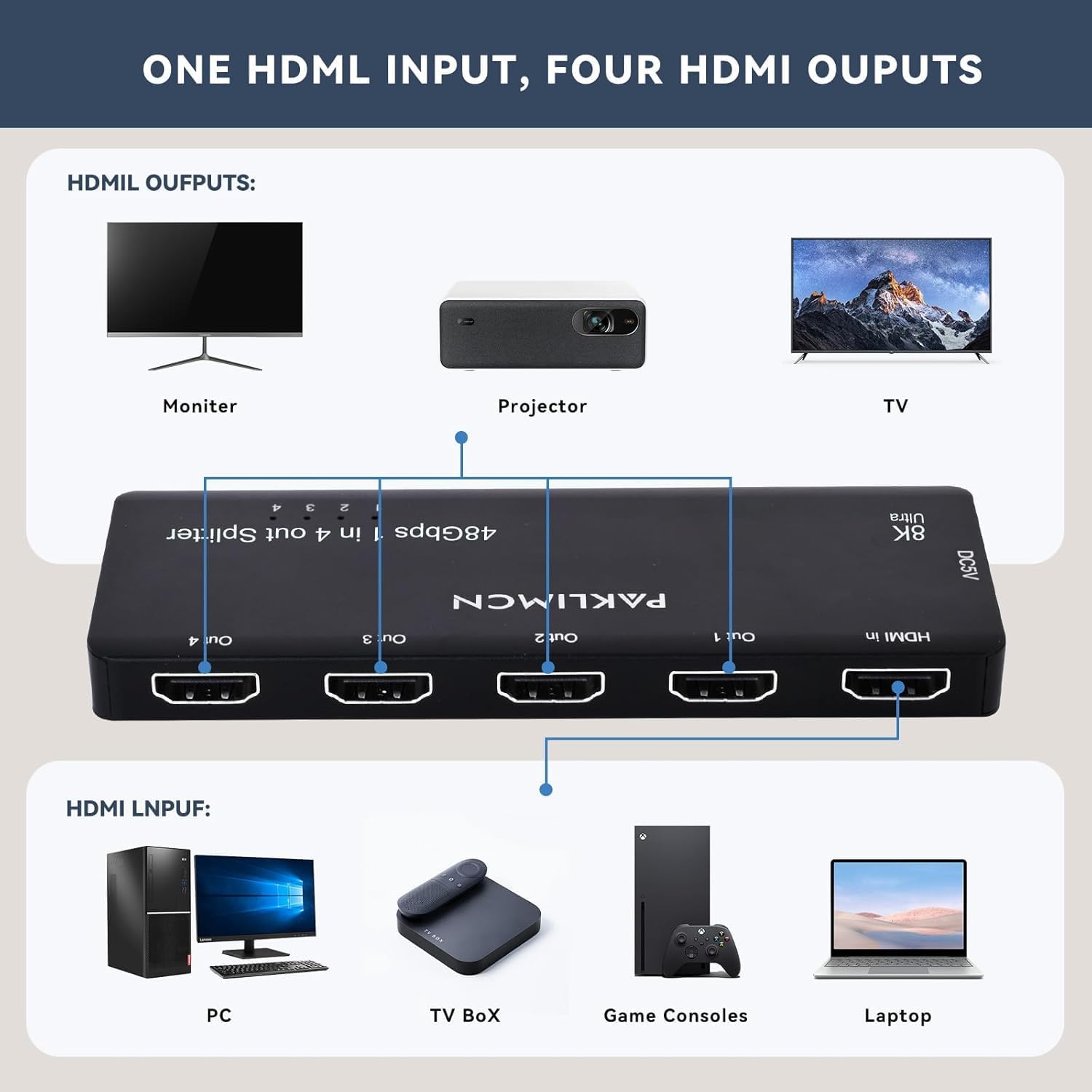 PAKLIMCN HDMI splitter 1 in 4 out distributes 1 Hdmi input signal to 4 identical Hdmi output signals,transmit video and audio simultaneously without any quality loss. Note This Hdmi Splitter not 4 inputs 1 output switch(NOT bidirectional switcher).Just duplicate or "mirror" a single Hdmi source on four Hdmi displays. 4 displays will show the same picture simultaneously Features 1. Maxinum support 3840x2160@30Hz resolution,support 3D , Full Ultra HD 1080P 2. Support HDMI 1.4b version, HDCP 1.3 3. Input support: Computer, PS3, PS4, Xbox, Blu-ray DVD player, STB etc. 4. Output support: projectors, Full HDTVs, TV, monitor, etc. 5. Supported Audio: DTS-HD, Dolby-trueHD, DTS, Dolby-AC3, DSD etc. 6. Widely used for digital entertainment center, HDTV retail and show site, HDTV, STB, DVD, PS3 and Projector factory, space and security concerns, data center control, distribution, conference room presentation, school and corporate training environment Using 8K Premium Quality HDMI 2.0 Cable to gain vivid vedio display, pls search ASIN: B08G4Y3BF4 for 3FT/6FT/10FT HDMI 2.0 Cable.