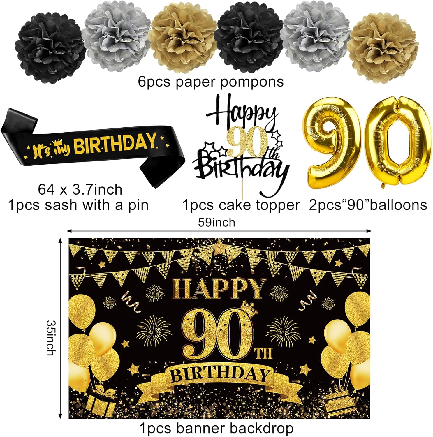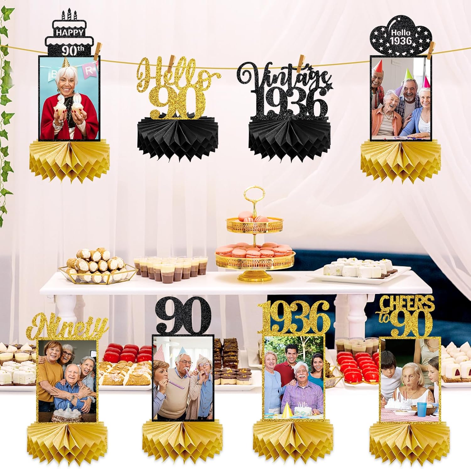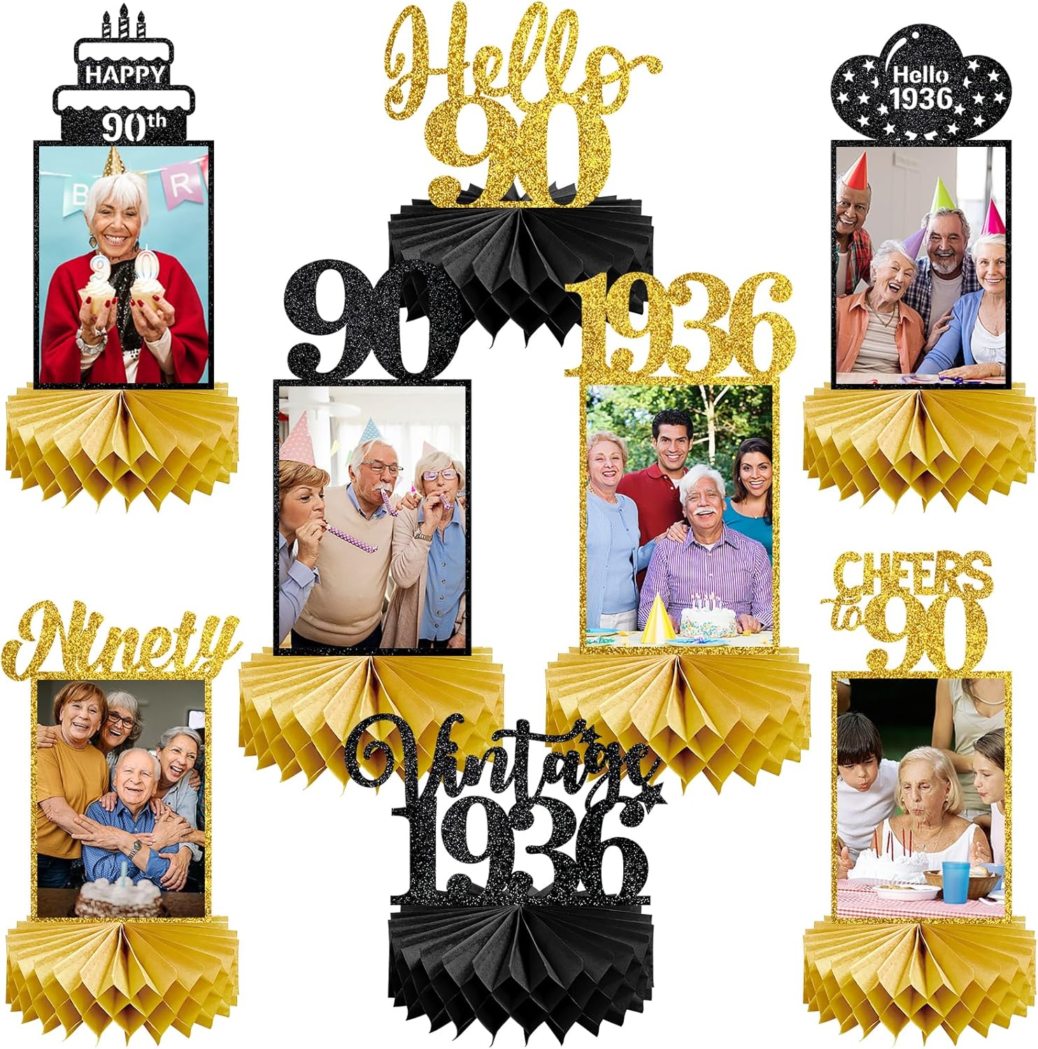 8Pcs 90th Birthday Decorations Honeycomb Centerpieces and 42PCS 90th Birthday Decoration Kit for Men Women, Black Gold Happy 90th Bday Banner Balloons Honeycomb Centerpiece Swirl Paper Pompoms Decor