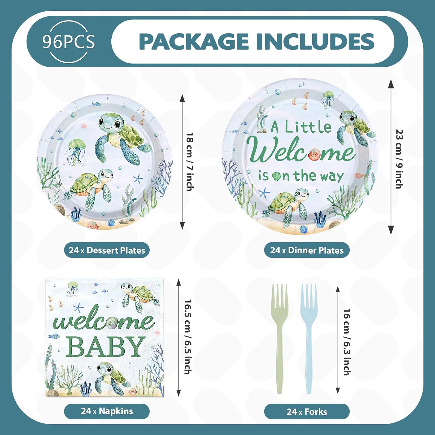 96 Pcs Sea Turtle Baby Shower Decorations Disposable A Little Hatchling is on The Way Paper Plates and Napkins Under The Sea Marine Theme Tableware Set for Welcome Baby Shower Birthday Party Supplies