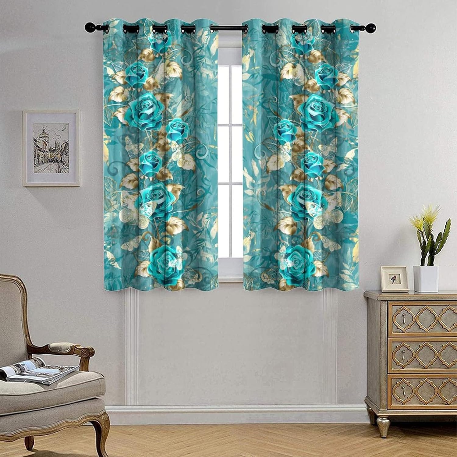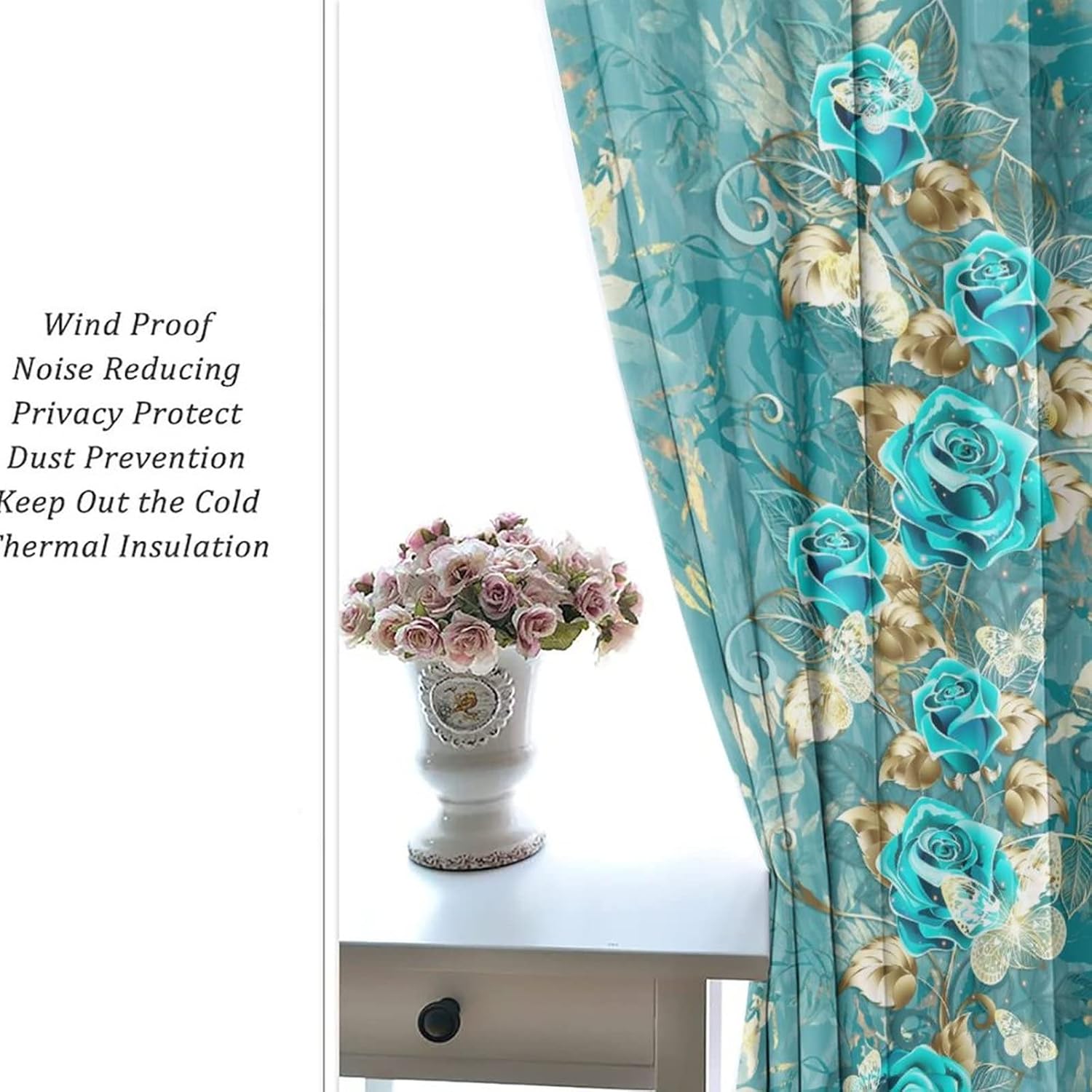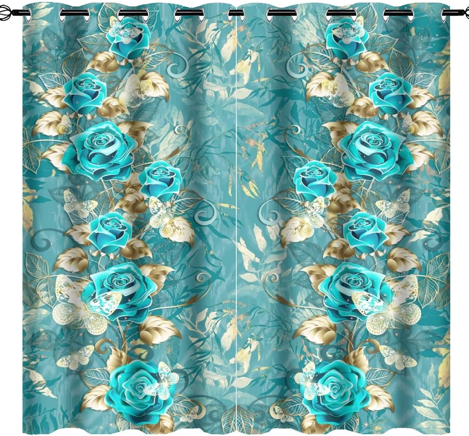 INSFBRB Abstract Turquoise Roses Patterned Blackout CurtainsThis Abstract Turquoise Roses Curtains liven up your indoor or outdoor spaces with a sense of airiness and beauty.Workmanship & Design:Each curtain is machine-made and neatly sewn with no loose threads. Soft, high-quality fabrics ensure long-lasting durability.Beautiful patterns, clever colour matching and advanced printing and dyeing processes for vibrant, fade-free colours.This Vintage Romantic Floral Roses White Gold Leaf Curtains is suitable for: living rooms, bedrooms, boys' rooms, girls' rooms, nurseries, dining rooms, offices, dormitories, window sills, etc.Care instructions.Machine wash in cold water or hand wash, do not bleach, iron at low temperature.Customer service.24 Hours customer support.