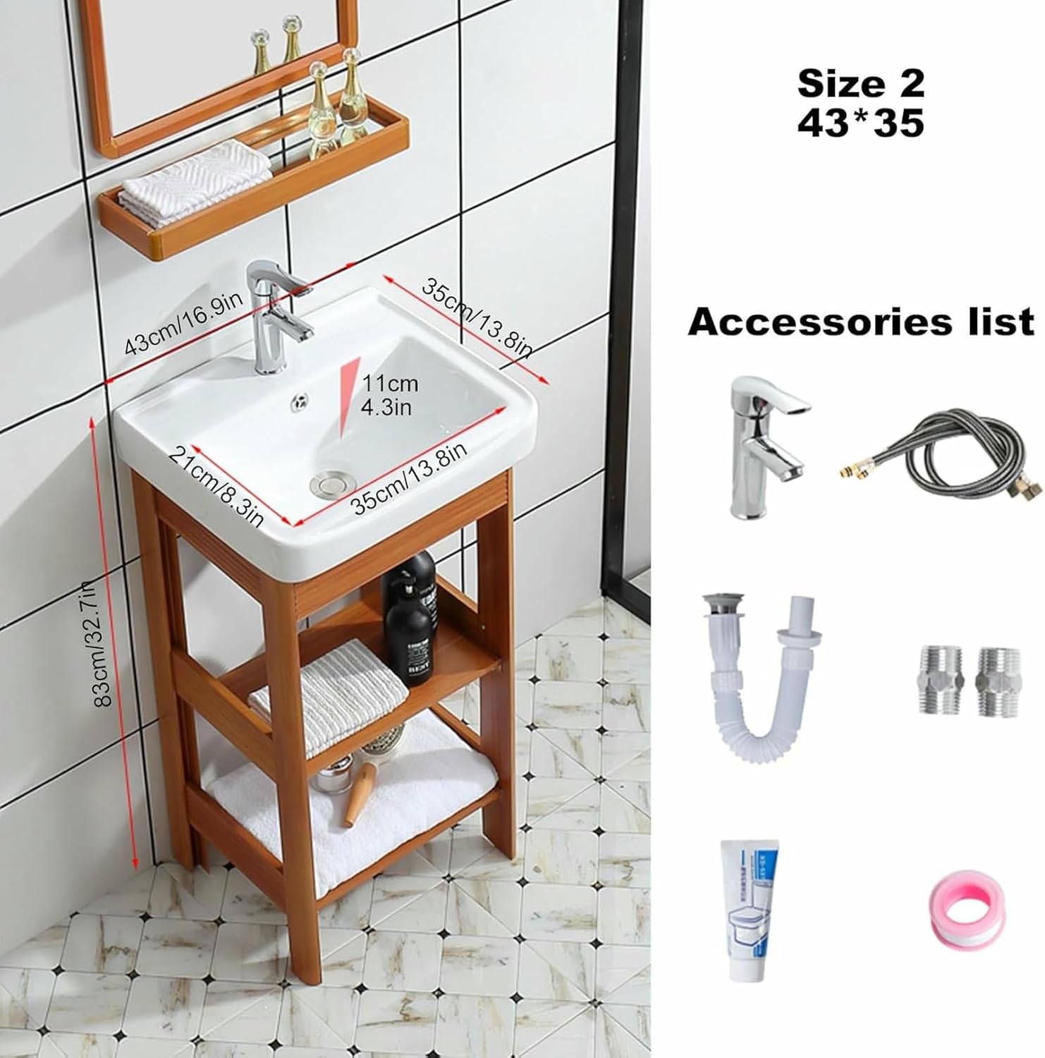 Product name: Freestanding yellow small ceramic sink with faucet/bracket/accessoriesProduct style: white + yellow wood patternProduct material: ceramic+ aluminum alloy bracketProduct Size:Size 1: 43*35*82.5cm/16.9*13.8*32.5inSize 2: 51.5*36.5*82.5cm/20.3*14.4*32.5inProduct accessories: ceramic sink, aluminum alloy bracket, silver hot and cold faucet (alloy material), water supply pipe, joint, integrated water pipe, raw material belt.Installation method: installed on the wallShipping package: One package (including all accessories)Applicable scenarios: bathroom, restroom, hotel, guest room, laundry room, outdoor courtyardIntroducing our elegant Freestanding Yellow Small Ceramic Sink, a perfect blend of functionality and style for your bathroom, restroom, hotel, guest room, laundry room, or even your outdoor courtyard. This premium sink comes with a unique white and yellow wood pattern, adding a touch of sophistication to your space.The set includes a silver hot and cold faucet made of premium alloy material, offering a sleek and modern look while providing efficient functionality. The water supply pipe, joint, integrated water pipe, and raw material belt are all included, ensuring a hassle-free installation process. Our freestanding ceramic sink is designed for convenience and practicality.Experience the perfect combination of form and function with our Freestanding Yellow Small Ceramic Sink. Upgrade your living spaces with this farmhouse-style wash b, designed for those who appreciate quality, style, and practicality. Note: All dimensions are measured manually, there may be an error of 0.5-1cm. Please refer to the actual object received.
