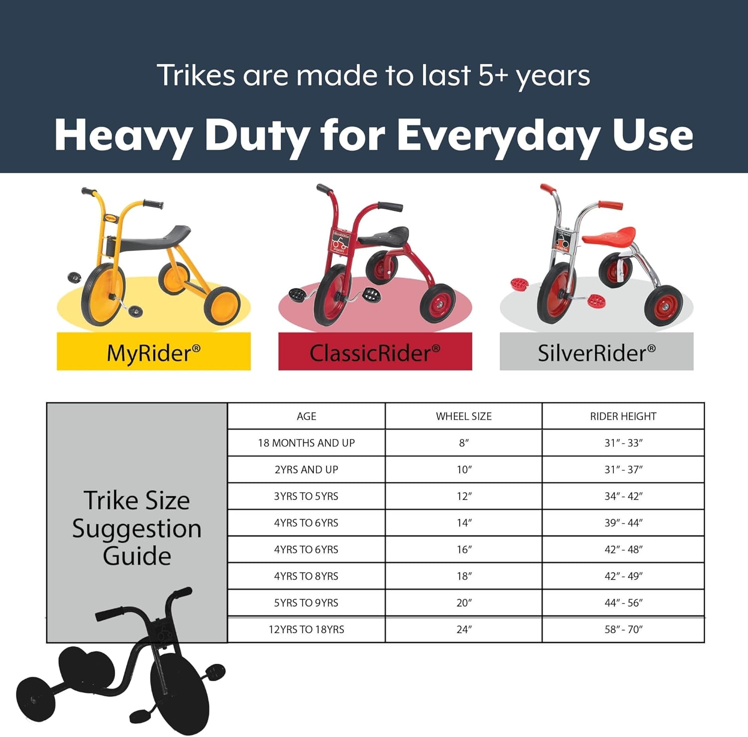 The Angeles MyRider 12" tricycle for toddlers is perfect for beginning riders. As for safety, all Angeles trikes feature a powder-coated steel frame that resists rust, as well as non-exposed pedal hardware and solid rubber tires on spokeless steel wheels. Trikes support children up to 70 lbs., and the recessed no-pinch hub is designed for safety. The seat measures 6"h, the front wheel measures 14.5" in diameter, and the handlebars measure 22"h. This kids tricycle also has a totally cool yellow and black design that your kids and toddlers will love! Assembly is a breeze with clear instructions and easy 1-step setup design.
