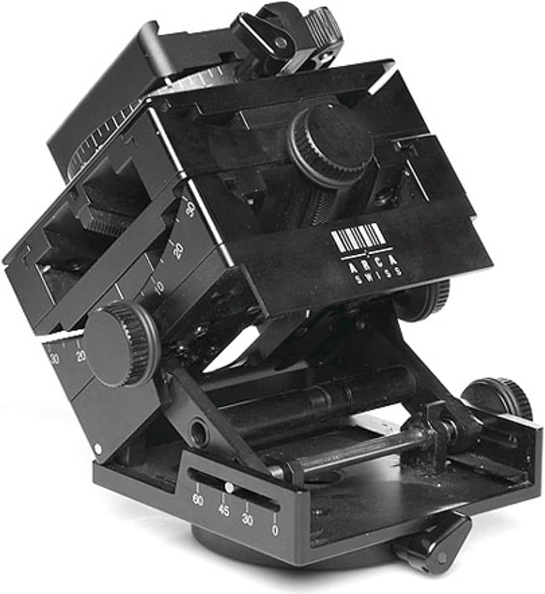 The C1 tripod head, ARCA-SWISS C1 cube with its unique patented design makes possible, a level hitherto never reached, secure and precise camera positioning through precision workmanship and variety of movements. Photographic apparatuses can be moved micrometrically in two axes. Because the camera moves inside the circular arc, object distance and image window are hardly altered. A panorama at the base of the tripod head serves to align the camera / recording instrument to the object. Having aligned and levelled the unit, a second panorama, located above the tilting axes permits swivelling movements of 360½ without altering the perpendicular. The camera is fastened with the new, patented ARCA-SWISS Flip-lock quick release system which guarantees secure displacements or quick exchanges of the units by way of two functions. In spite of the complexity of the device and the required stability, it has been possible to reduce the dimensional weight by a sensational 63%. It now amounts to only 35 oz / 994 grams