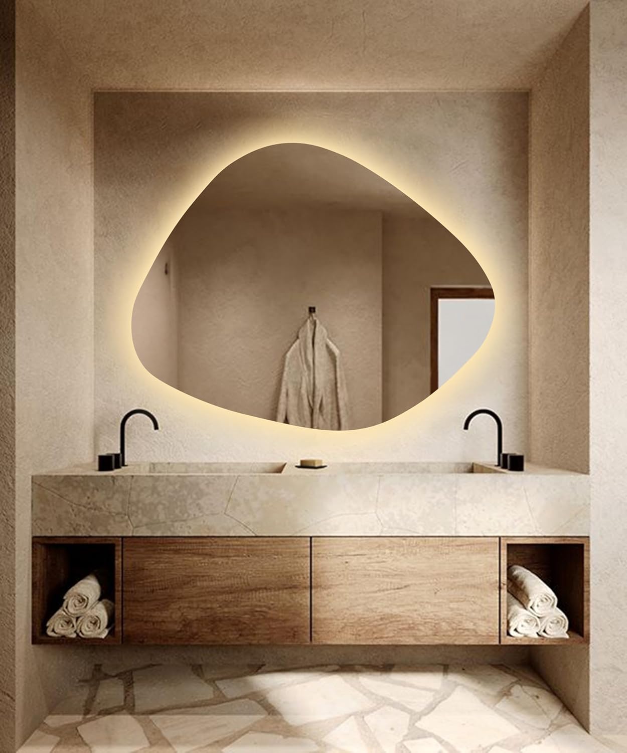 FAWdecor Asymmetrical LED Bathroom Mirror with Lights This Wall Mirrors are handcrafted with care and attention to detail and design, invisible wood back frame from the front to realized the sturdiness and consistent aesthetic beauty of the design. Used as a vanity mirror or a decorative mirror in your bedroom, living room, bathroom, vanity room, gallery wall, entryway, hallways, salons.Visually expand the space, increase the light, enhance the beauty of any space. Elevate your bathroom decor with the FAWdecor Asymmetrical LED Bathroom Mirror, a perfect blend of functionality and artistic design. This irregularly shaped vanity mirror is more than just a reflection; it’s a statement piece that enhances any modern or contemporary space. Key Features: 1. Unique Asymmetrical Design: The irregular shape adds a touch of elegance and creativity, making it a stunning focal point for your bathroom, bedroom, or dressing area. 2. Integrated LED Lighting: Soft, energy-efficient LED lights illuminate your face evenly, providing optimal lighting for makeup application, grooming, and skincare routines. The built-in lighting eliminates shadows, ensuring a flawless look every time. 3. High-Quality Craftsmanship: Crafted with premium materials, this mirror features a crystal-clear reflection, anti-fog functionality, and durable construction for long-lasting performance. 4. Versatile Mounting: Designed for wall installation, this decorative mirror seamlessly integrates into your bathroom, powder room, or vanity setup, complementing a variety of interior styles. 5. Energy Efficiency: The LED technology not only provides superior lighting but also ensures minimal energy consumption, making it an eco-friendly choice for your home. Why Choose FAWdecor? Transform your space with this stylish and practical LED mirror, perfect for those who value both aesthetics and functionality. Whether you’re upgrading your bathroom or adding a unique piece to your home, this asymmetrical mirror is designed to impress.