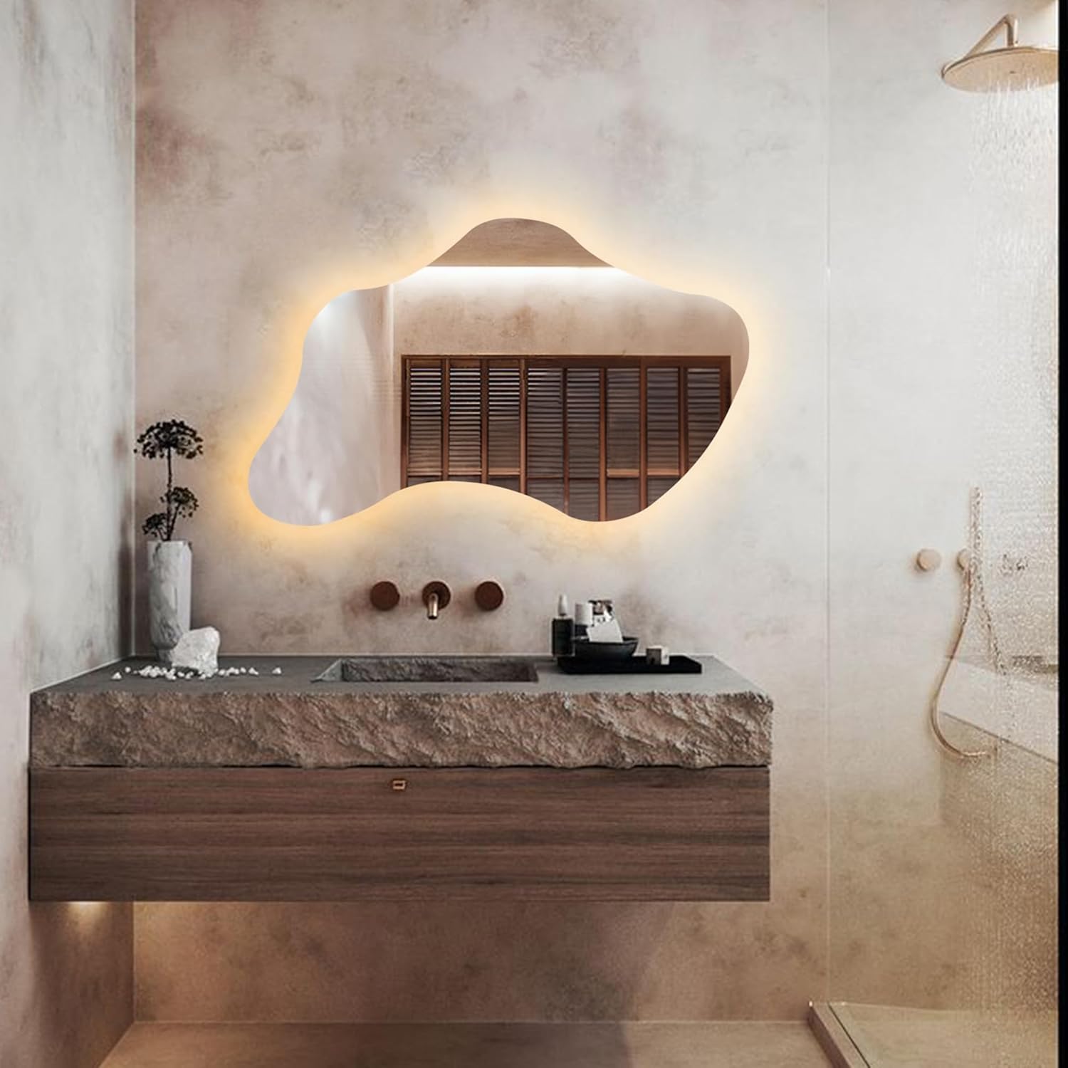 FAWdecor Asymmetrical Led Mirror, Modern Hanging Mirror, Irregular Bathroom Wall Mirror, Aesthetic Mirror with Ligths, Cool & Warm Lighted Led Mirror ✓ The asymmetrical shaped modern mirror with led will add a completely different ambiance to your home. ✓ You will find the perfection of mirror and light in this irregular mirror. ✓ It will color every wall of your home. ✓ You can use these wonderful mirrors whether you are doing make-up,in your living room or in your bathroom. Designed for both horizontal and vertical installation. Asymmetrical mirror combined with LED that will add perfection to your home. A great led mirror that you can use in your bathroom or while making up. The LEDs are not affected by steam and water. The color options for the LEDs are Warm Light and Cool Light. Also you can get it Without LED to use it as a normal mirror. The adapter is shipped with the mirror. DIMENSIONS XSmall : 28x45 cm | 10.9"x17.7" inches Small : 37x60 cm | 14.5"x23.6" inches Medium : 46x75 cm | 18.1"x29.5" inches Large : 55x90 cm | 21.8"x35.4" inches XLarge : 68x110 cm | 26.6"x43.3" inches XXLarge: 80x130 cm | 31.5"x51.2" inches. In order not to damage the perfect image of the mirror, we did not put a touch key. Please check the operating systems carefully on the last photo, your item will be delivered to operate both usage styles (We send all needed parts for both usage styles.) ✓ There is 18 mm mdf behind the mirror and the led is glued to the mdf. This handy irregular mirror will look great in your bathroom. It is suitable for electricity between 100 v and 240 v. We pack our products in styrofoam molds and with strong cardboard to prevent them from breaking. Please visit my store to see our other mirrors and color your home.