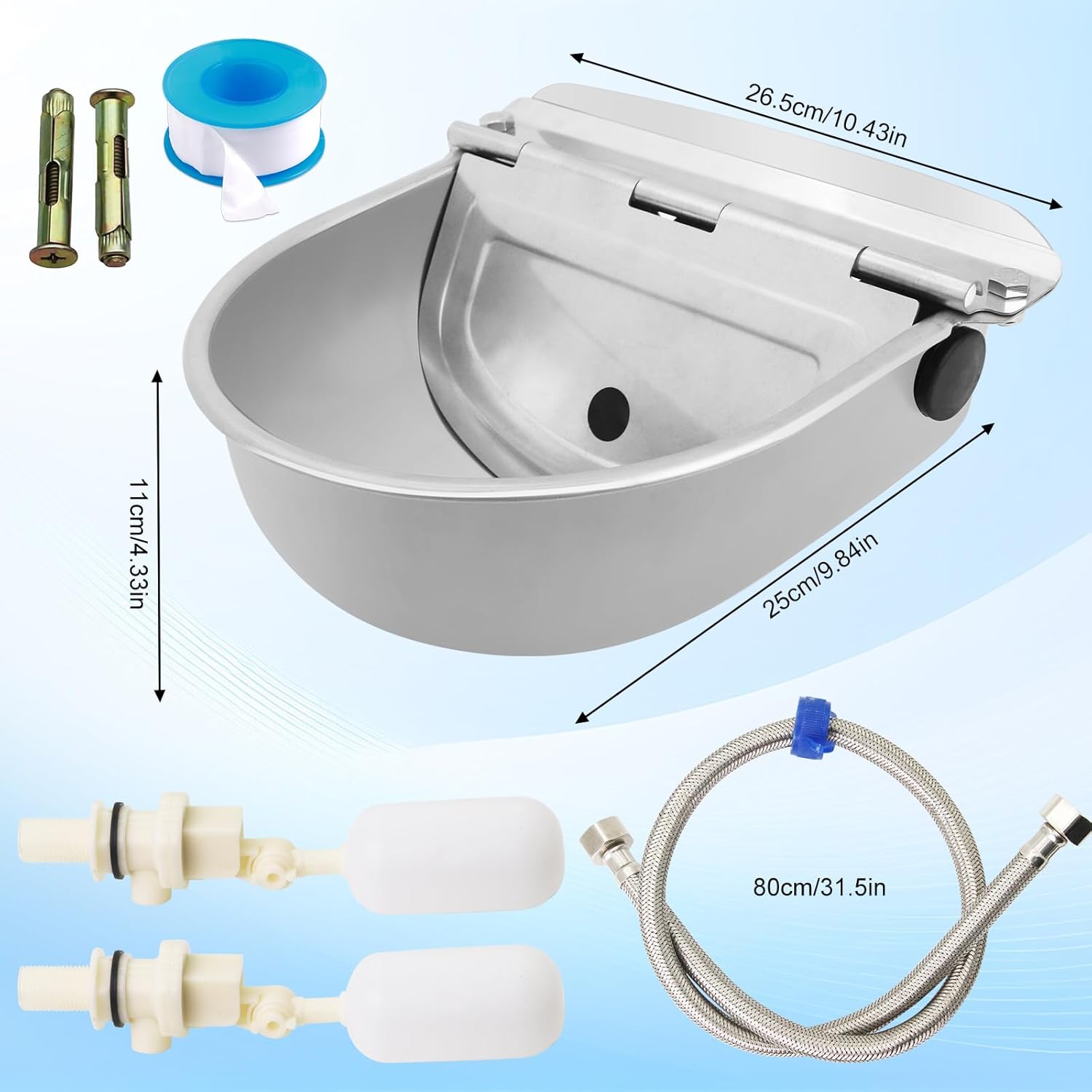 | Included Components | 1 * automatic dog water bowl, 1 * extended float ball, 1 * 80cm water pipe, 1 * 1/2 quick connect female connector, 1 * 3/4 quick connect male connector, 1 * 1/2 connector, 1 * raw tape, 2 * expansion screw. |