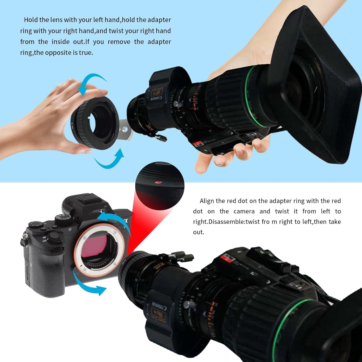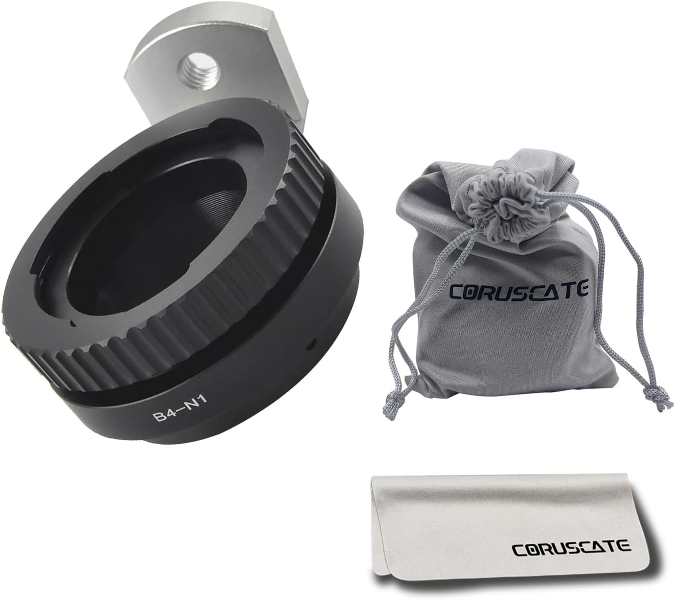 CORUSCATE Mount adapter allows B4 (2/3") mount lens compatible with NEX E mount camera.Proven optics meet the latest imaging advancements.So many possibilities.Quick and inexpensive way to adapt lenses to your camera.compatible Lens:compatible with B4 (2/3") mount lenscompatible Camera:E mount cameras compatible with a1,a9 II,a9,a7S III,a7S II,a7S,a7R V,a7R IV,a7R III,a7R II,a7R,a7C,a7 IV,a7 III,a7II,a7,a6600,a6500,a6400,a6300,a6100,a6000,a5100,a5000,a3500,a3000, NEX-7,NEX-6,NEX-5T,NEX-5R,NEX-5N,NEX-5,NEX-F3,NEX-C3,NEX-3N,NEX-3,ILCE-QX1,ZV-E10Precisely matchedCrafted from aviation grade aluminum and magnesium alloy,is strong and lightweight with a durable finish,really very resistant and performing for vintage lenses.Preserve the durability of your camera body and lens.There is no glass inside of the adapter,ensuring no loss of image quality and the connection between the camera mount and lens is precisely parallel,critical for sharpness outside of the center of the image.Same image qualityWhen used with the Mount Adapter B4-NEX,compatible B4 (2/3") mount lens-Mount lenses retain all of their sharpness and image quality, and many gain the benefits of the NEX E mount camera system.A natural fitMount Adapter seamlessly bridges the gap between B4 (2/3") mount lens and the NEX E mount camera.Your B4 (2/3")-Mount lenses will feel as if they were made for your NEX E series cameraNote: if your camera indicated "lens is not properly installed",please modify the camera menu settings.Usually called the release the shutter the lens is not installed",you can modify the settings to allow.Specifically refer to the camera manual Although the lens will fit physically,automatic diaphragm, auto-focusing, or any other functions will not operate while using this adapter.There is no electrical contacts in the adapter ring.Full manual operation,manual focus,manual iris adjustment can be achieved with body manual exposure,aperture priority exposure.In this case "stop-down mode"will need to be used when metering since the lens does not have the ability to have its aperture controlled by the camera body.You can shoot in Manual or Aperture Priority Mode.Before use,set your camera Menu:"Shoot without lens".
