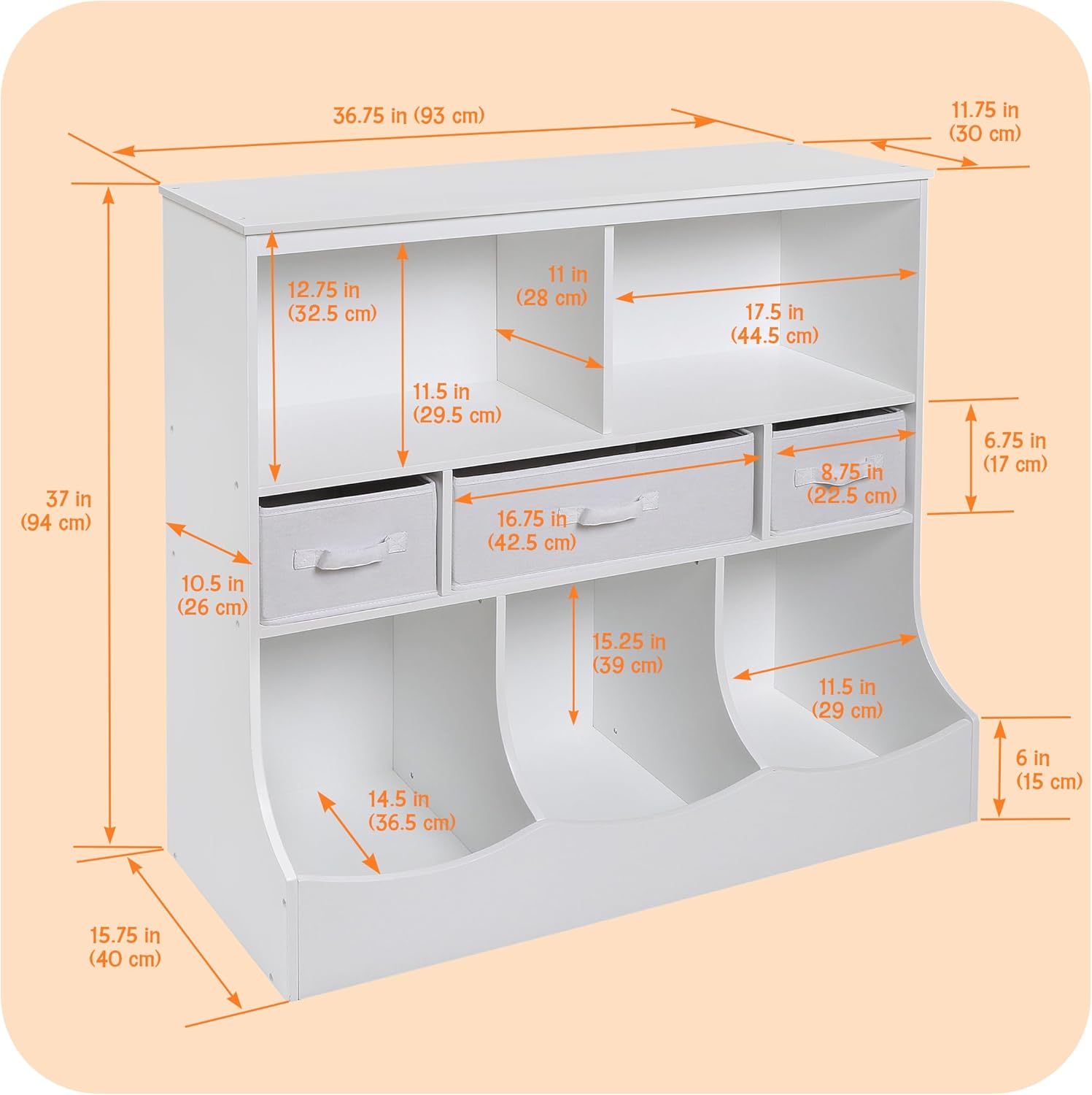 Product Description Badger Basket's Combo Bin Storage Unit with Three Baskets is a sturdy solution for keeping all kinds of items organized. Features two open shelves, three baskets in two different sizes, and three cubby bins. A versatile unit for the nursery, children's rooms, playrooms and game rooms, entryways and foyers, and family rooms. Great for kids when they are learning to put things away. Top surface offers an additional place to stack books or display souvenirs. You may choose not to use the baskets and instead have three additional open shelves. Smooth surfaces are easy to clean. Made with engineered wood. Baskets made with non-woven fabric and internal cardboard support panels. Overall unit measures 36-5/8 inches L x 15.75 inches W at the bottom (10-5/8 inches deep at top) x 36.75 inches H. Shelf areas each: 17-3/8 inches W x 10-5/8 inches D x 13 inches H (height to lower edge of top trim is 11-5/8 inches). Small baskets: 8 inches Wide x 10 inches Deep x 6 inches High. Shelves for small baskets: 8-5/8 inches Wide x 10-5/8 inches Deep x 6.75 inches High. Large basket: 16.75 inches Wide x 10 inches Deep x 6 inches High. Shelf for large basket: 16-7/8 inches Wide x 10-5/8 inches Deep x 6.75 inches High. Bottom bins - interior width and height: 11-3/8 inches Wide x 15-3/8 inches High. Bottom bins - depth at bottom of bin: 14.5 inches Deep. Bottom bins - depth at top of bin: 10-5/8 inches Deep. Height from floor to highest edge of scalloped front trim: 6 inches. Height from floor to lowest edge of scalloped front trim: 5 inches. From floor to baskets shelf is 15-7/8 inches H. From floor to top open cubby shelves is 23.25 inches H. Assembled weight: 52.8 pounds. All measurements approximate. Wipe clean and dry thoroughly. Spot clean the baskets. Adult assembly required. Non-toxic painted finish. Product may vary slightly from shown. Props/accessories shown are for illustration purposes only. Item ships in its original carton that may include a product photo. From the Manufacturer Badger Basket's orderly Combo Bin Storage Unit pulls together toys, books, games, art supplies, shoes, winter gear, fashion accessories, and more. Use the shelves, baskets, and bins to gain control of a variety of items in any room of your house, particularly messy kids' rooms and busy entryways.
