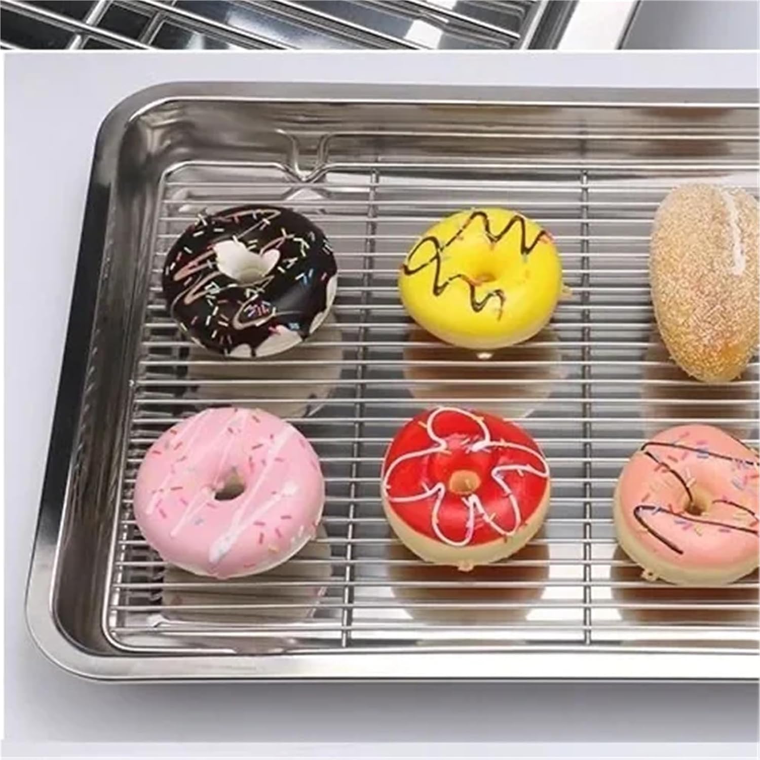 Product: Stainless Steel Baking PanMaterial: 304 stainless steelColor: Silversize:S: 9.3 inches x 7 inchesM: 10.5 inches x 8 inchesL: 12.5 inches x 10 inchesThe package includes: 1 baking tray and 1 cooling rack.Notice:Due to differences in monitors, shooting light, and environment, there will be some color difference between the actual color and the color in the picture, which is normal.Due to manual measurement, product dimensions may have an error of 0.5-1 cm.
