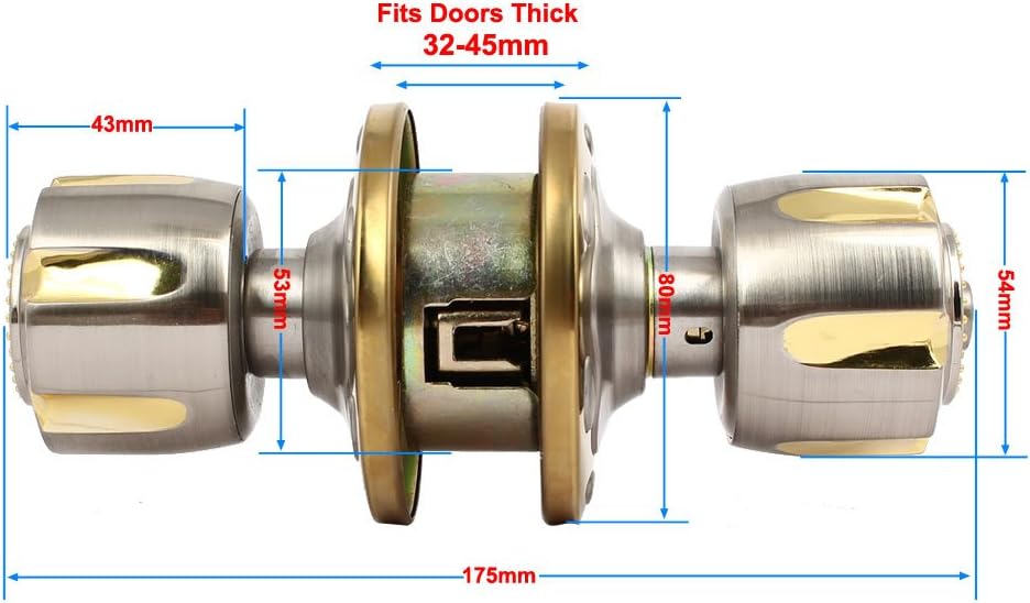 Durable all metal construction and plating finish.Ball knob. Fit for both right handed and left handed doors.Easy to install and supplied with fitting instructions and fixing parts. 200 thousand times test.Suitable for indoor and outdoor use;Best used for residential exterior entry doors.Please make sure your door hole and thickness to fit the item size before buying. 0SpecificationOverall Size : 175 x 80mm / 6.9 Inch x 3 Inch (L*Max.D)Lache length: 50mm / 2 InchBackset: 60mm / 2-3/8 InchEdge Bore Diameter: 25mm / 1 InchFace Bore Diameter: 54mm / 2-1/8 InchFit Door Thickness: 1-1/4 Inch to 1-3/4 InchMain Material : Zinc Alloy, 304 Stainless Steel, Stainless Steel, BrassFinish: PlatingModel Number: 5900A-SS/SBPackage Content: 1 x Door Knob Lock, 3 x Keys, Some Fixing Parts