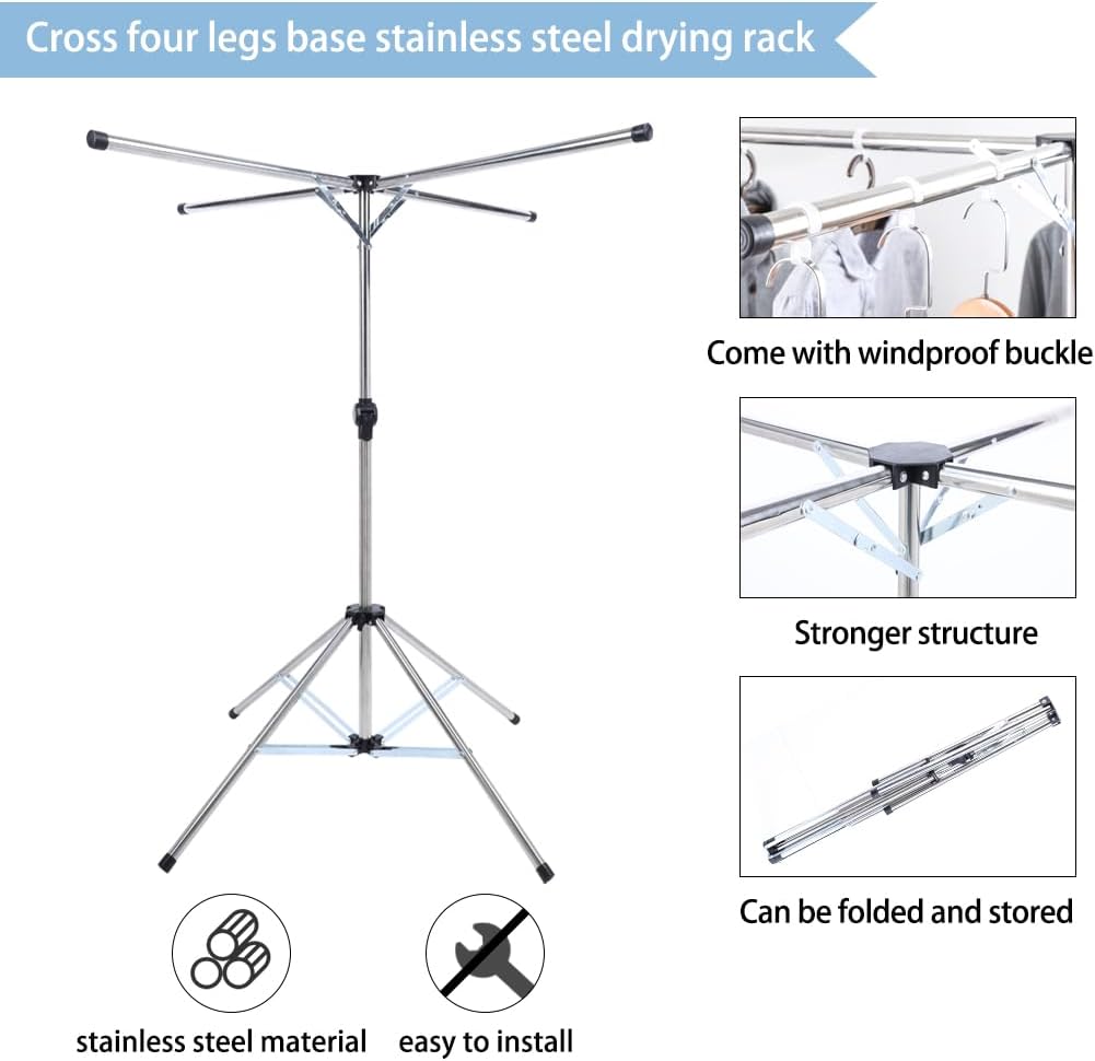 BAOYOUNI Foldable Clothes Drying Rack Stainless Steel Laundry Airer Collapsible Garment Stand Height Adjustable with Hanging Rails for Indoor Outside Balcony - 4 Legs