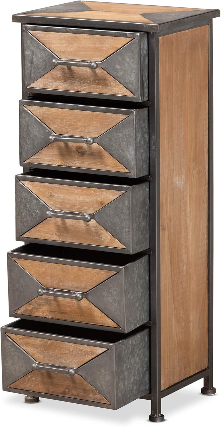 A contemporary take on industrial design, the Laurel cabinet enriches any space. Made in China, the Laurel is comprised of an antique grey finished metal frame combined with whitewashed oak finished wood and further enhanced with sleek, angular accents. Five drawers provide ample storage space to keep items organized and out of sight. Fully assembled, each drawer features a vintage style handle for easy access. An eye-catching accent that transforms any space, the Laurel cabinet is an exceptional addition to the modern home.